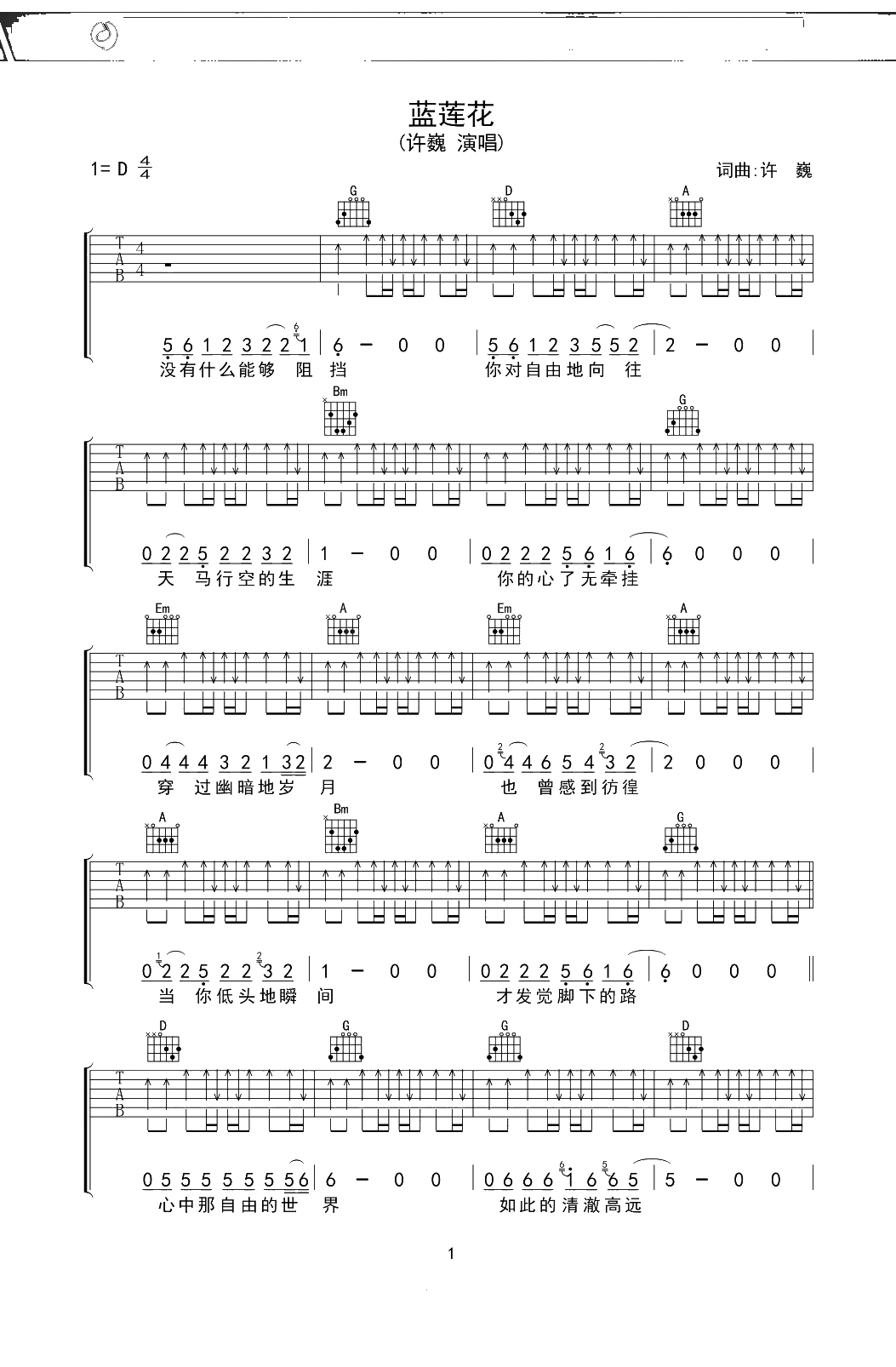 许巍《蓝莲花》吉他谱 弹唱六线谱吉他谱