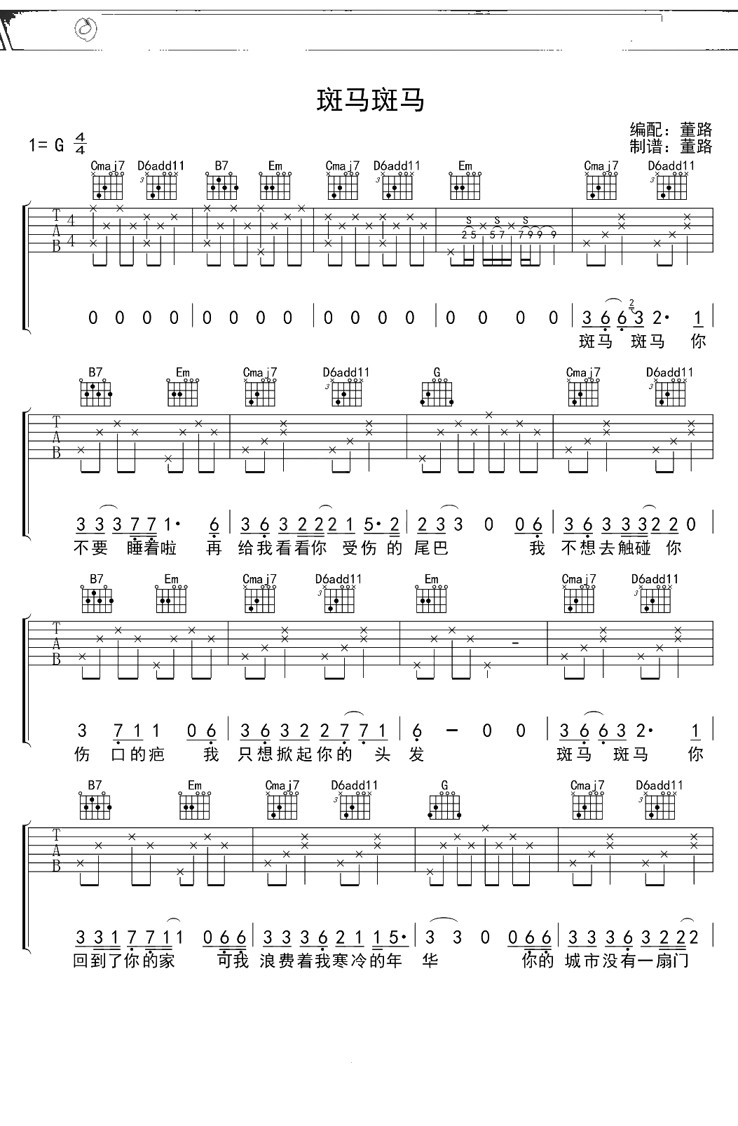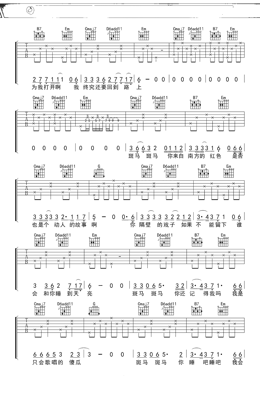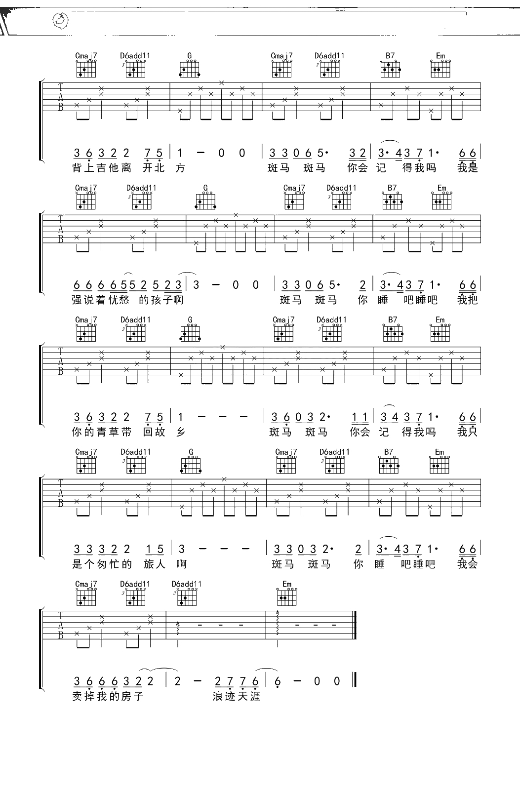 宋冬野《斑马斑马》吉他谱 G调吉他弹奏曲谱吉他谱