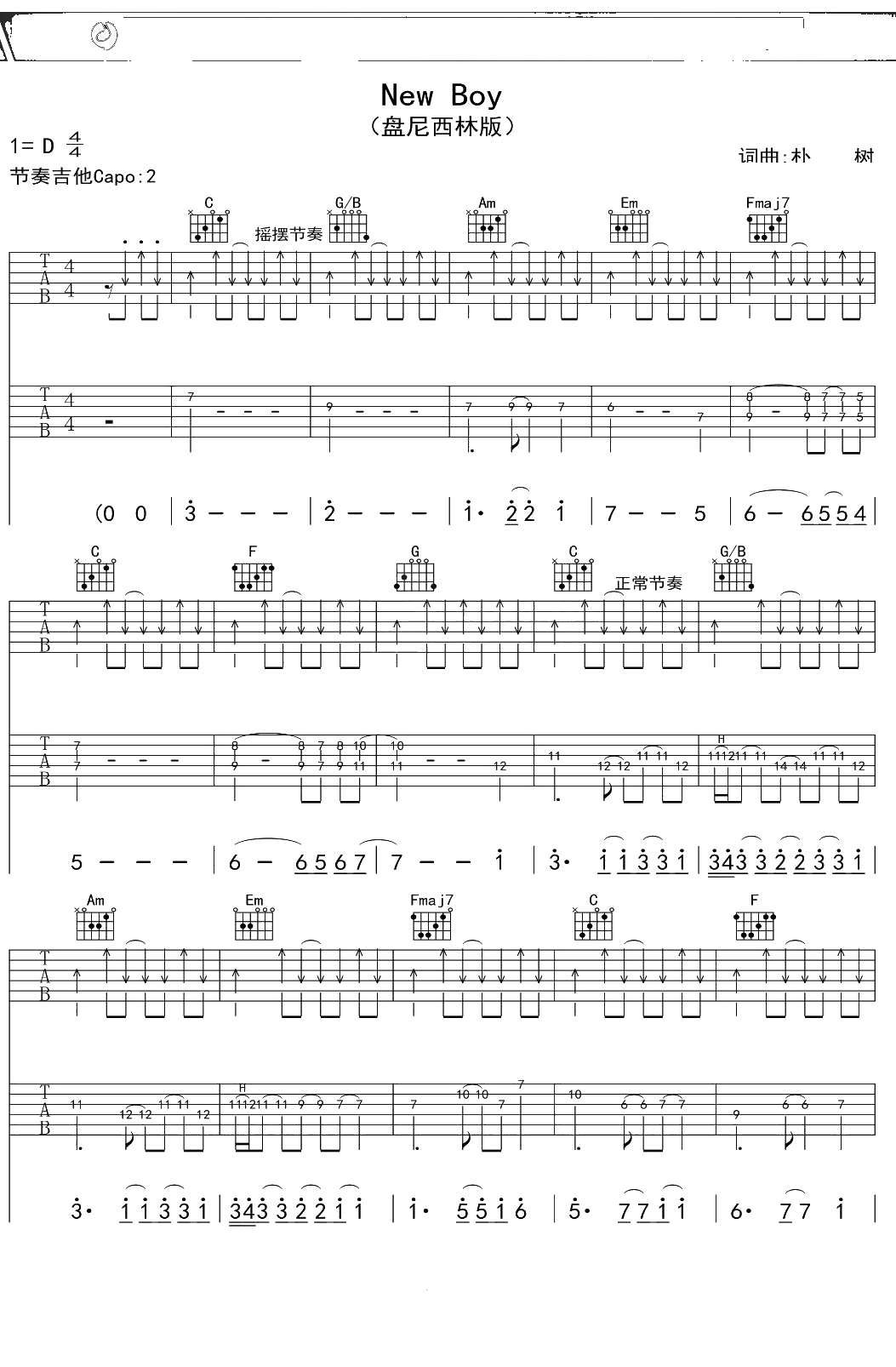 盘尼西林乐队《New Boy》吉他谱 D调弹唱六线谱吉他谱