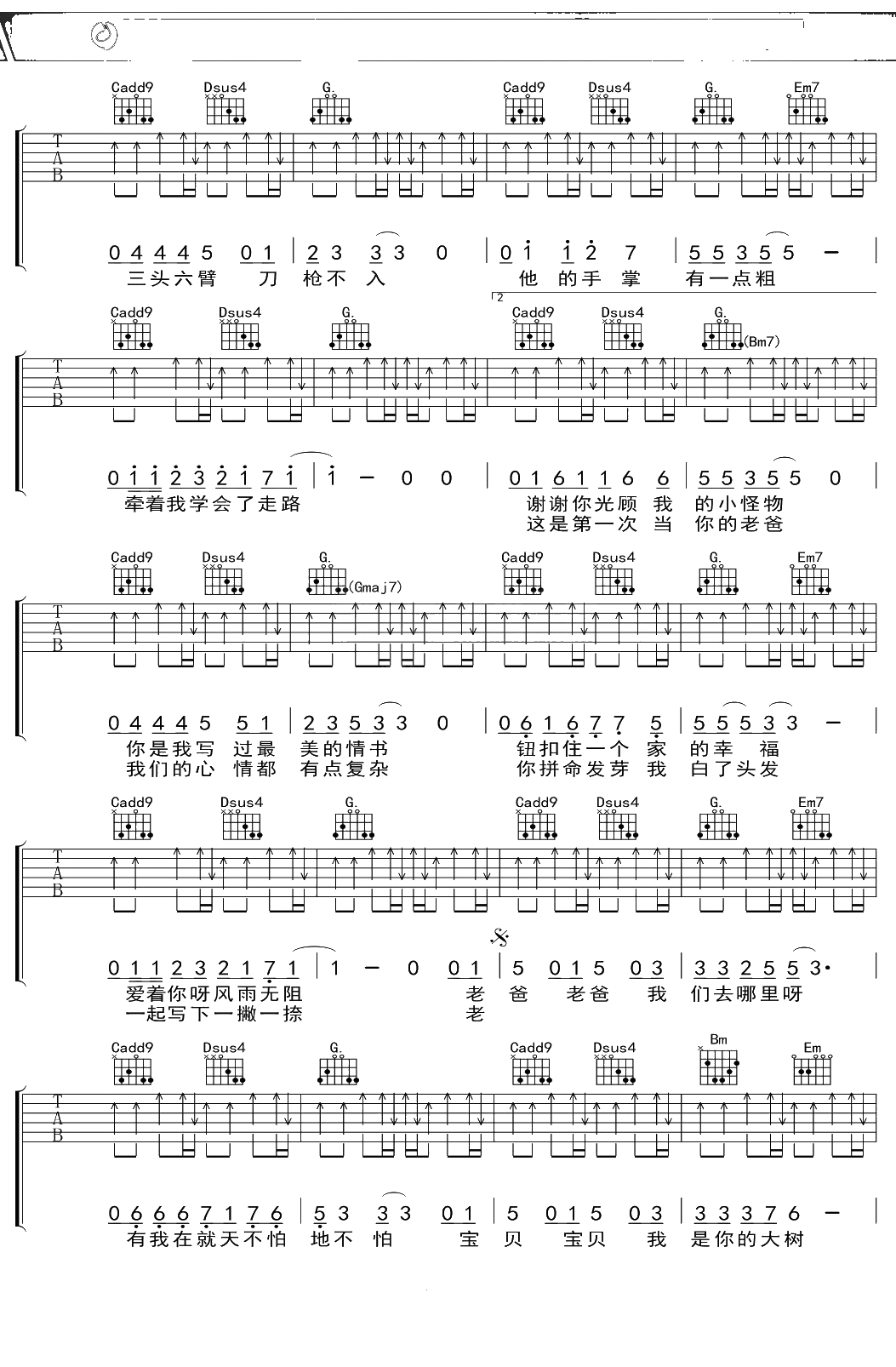 爸爸去哪主题曲《爸爸去哪儿》吉他谱 G调弹唱六线谱吉他谱