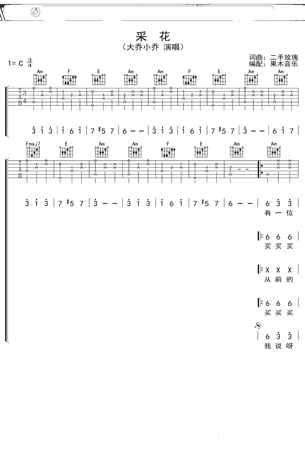 大桥小乔《采花》吉他谱 C调弹唱六线谱吉他谱