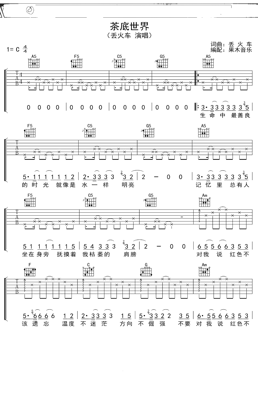 丢火车乐队《茶底世界》吉他谱 C调弹唱六线谱吉他谱