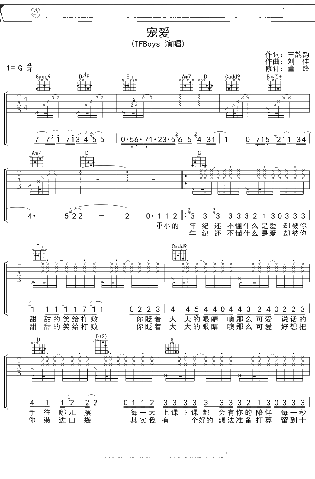 Tfboys《宠爱》吉他谱 G调弹唱六线谱吉他谱