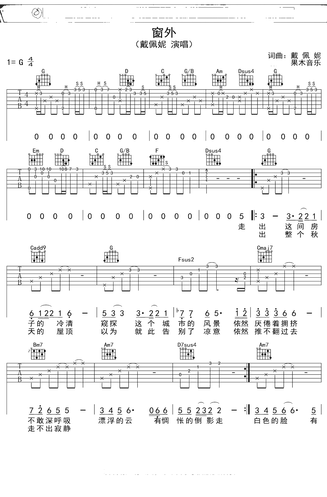 戴佩妮《窗外》吉他谱 G调弹唱六线谱