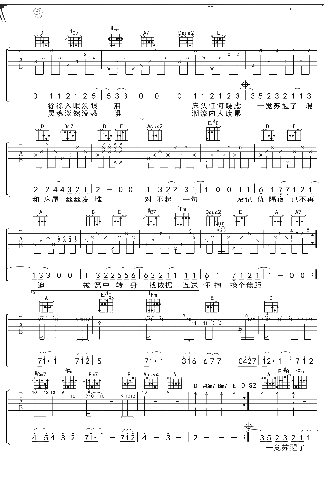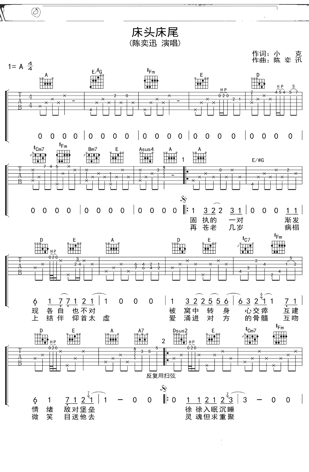 陈奕迅《床头床尾》吉他谱 A调吉他弹唱曲普吉他谱