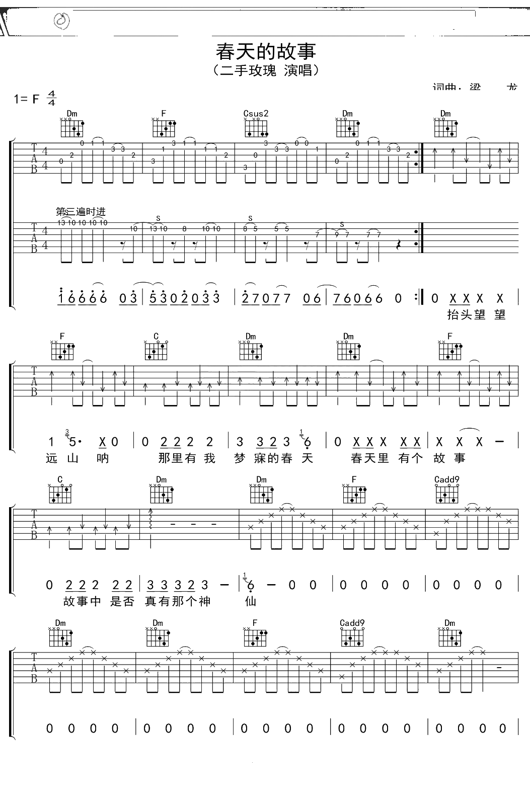 二手玫瑰《春天的故事》吉他谱 F调弹唱六线谱吉他谱