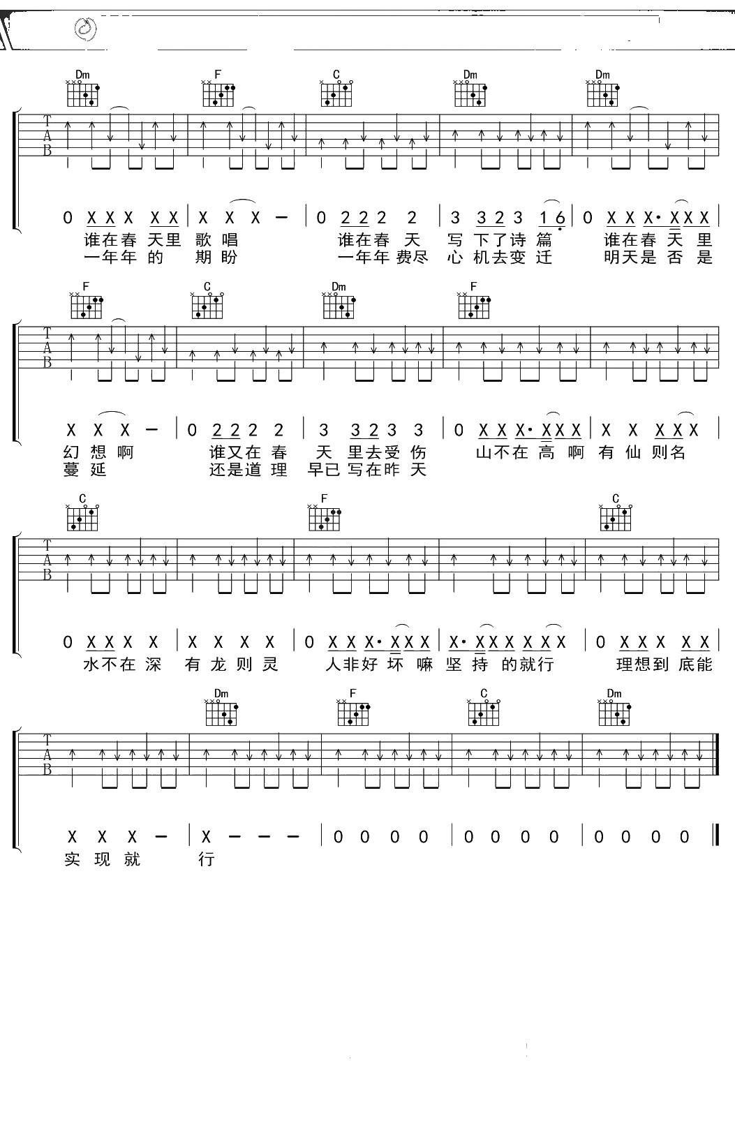 二手玫瑰《春天的故事》吉他谱 F调弹唱六线谱