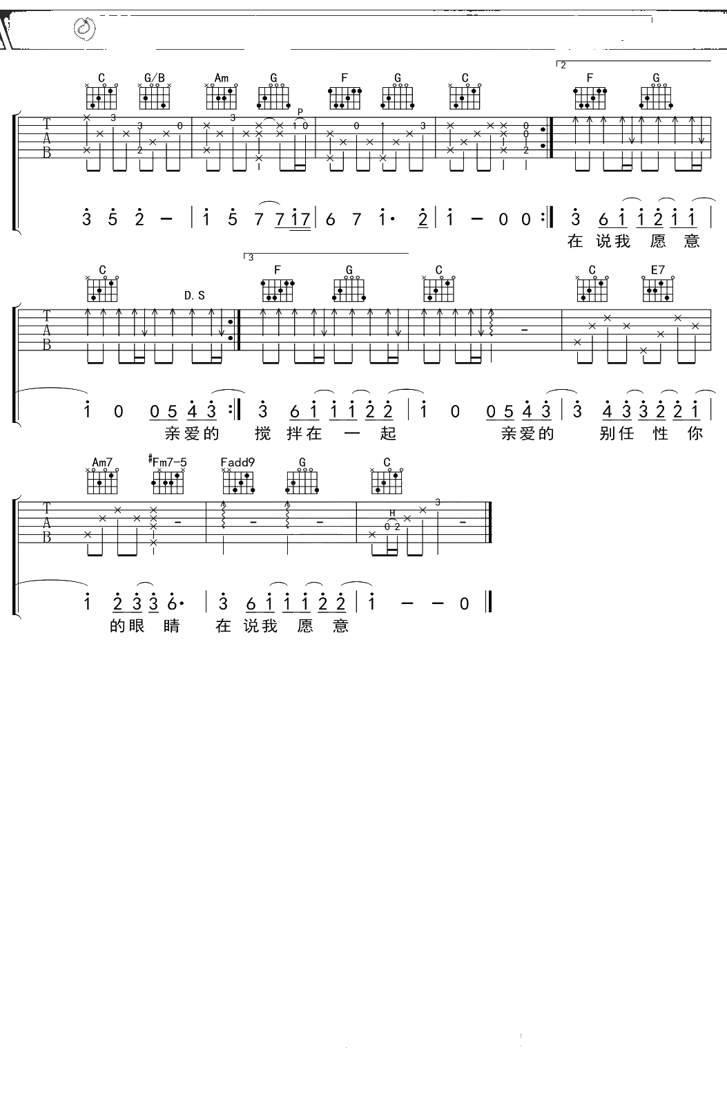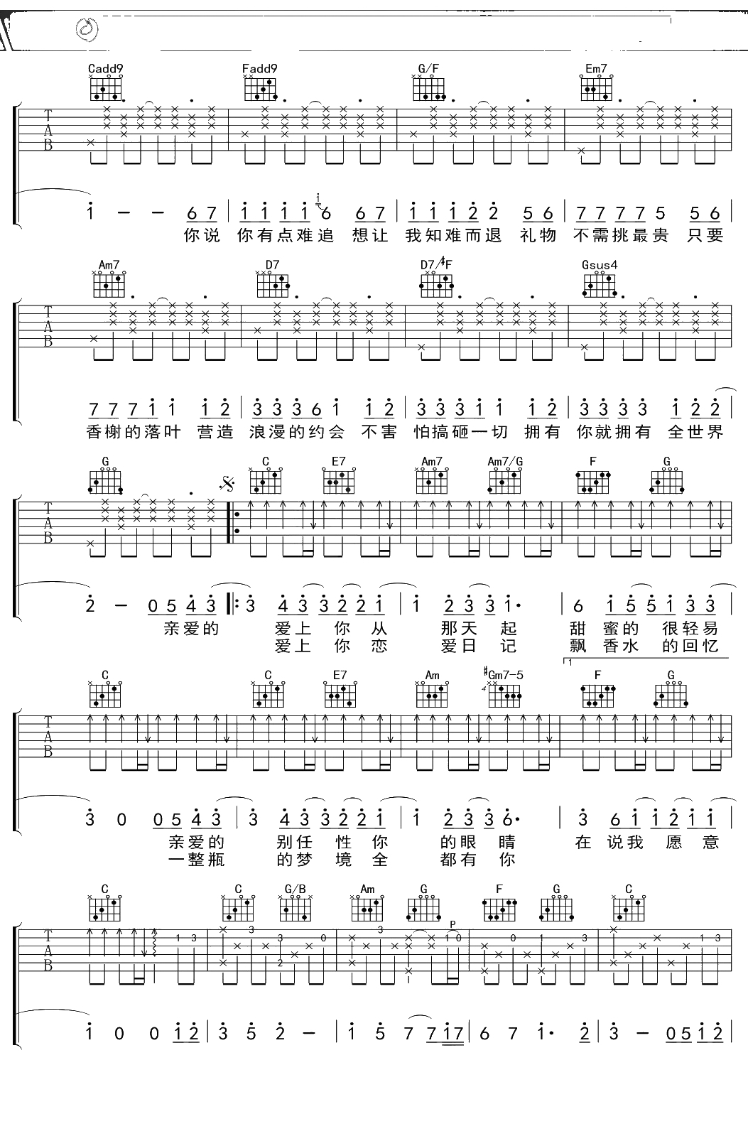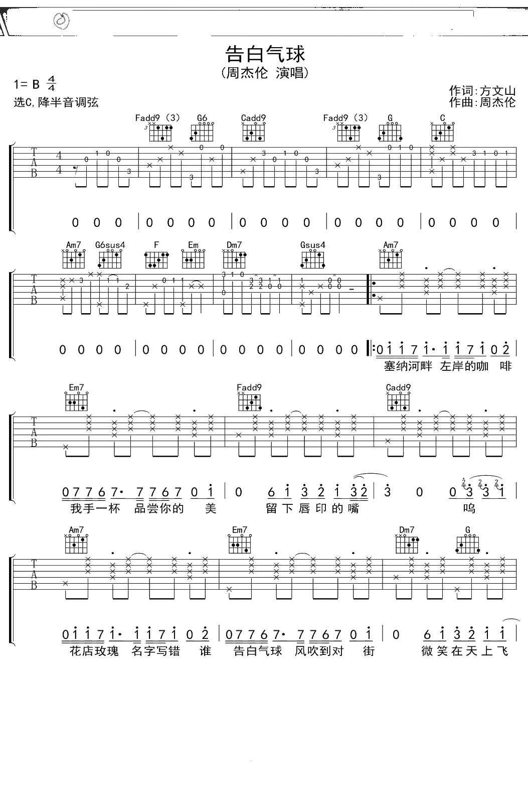 周杰伦《告白气球》吉他谱 C调弹唱六线谱