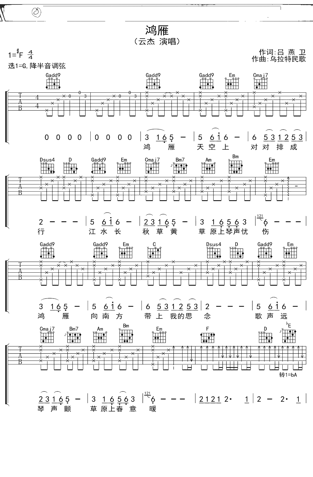 云杰《鸿雁》吉他谱 G调弹唱六线谱吉他谱