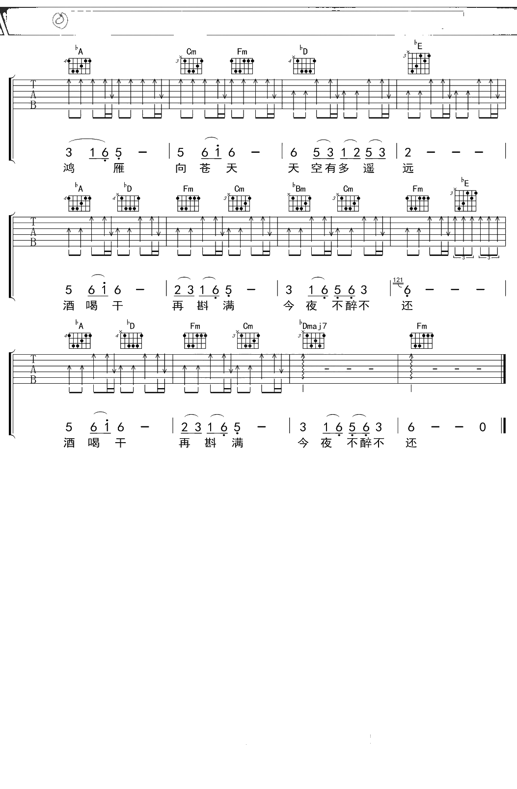 云杰《鸿雁》吉他谱 G调弹唱六线谱