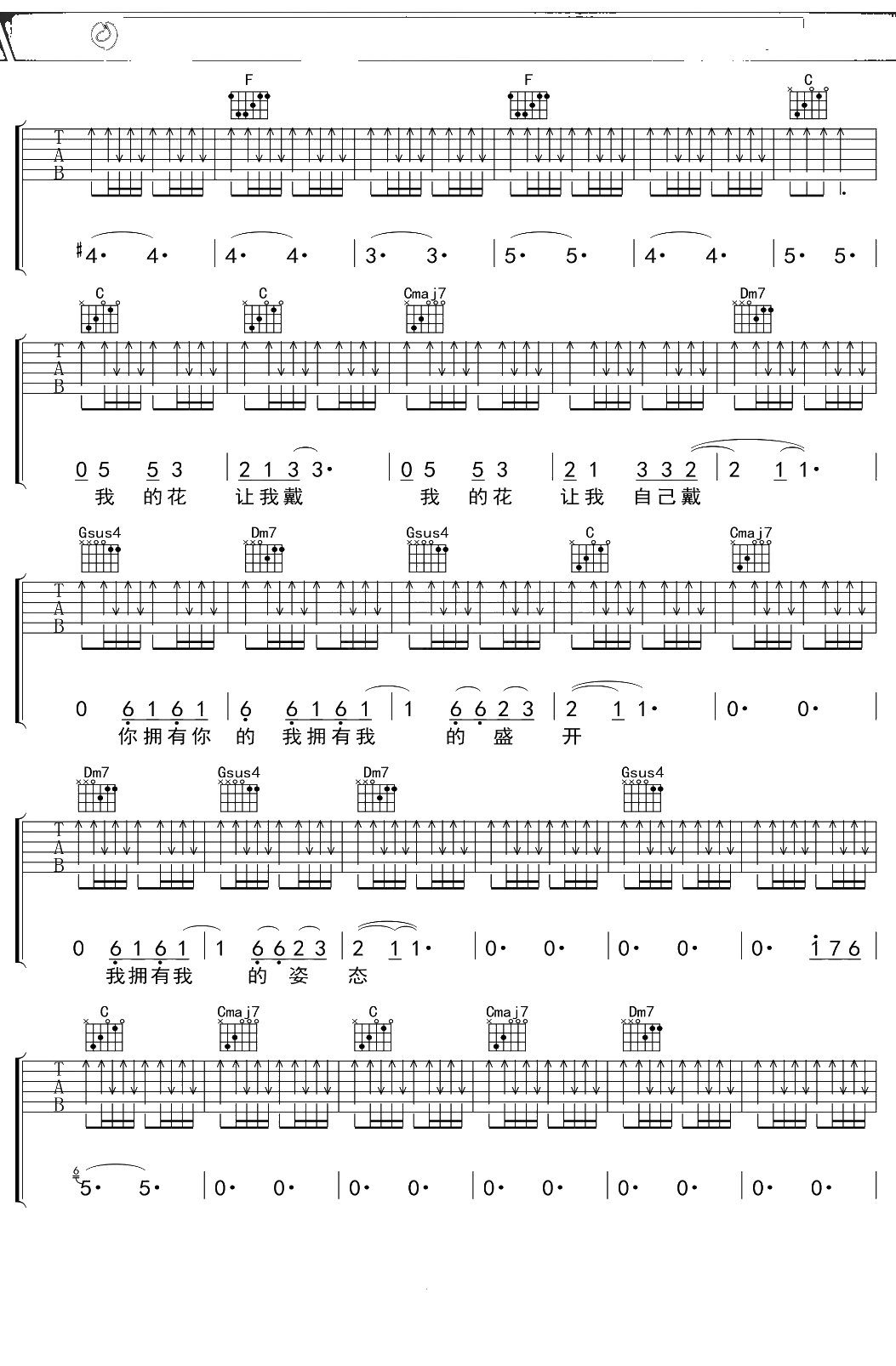 陈绮贞《花的姿态》吉他谱 C调弹唱六线谱