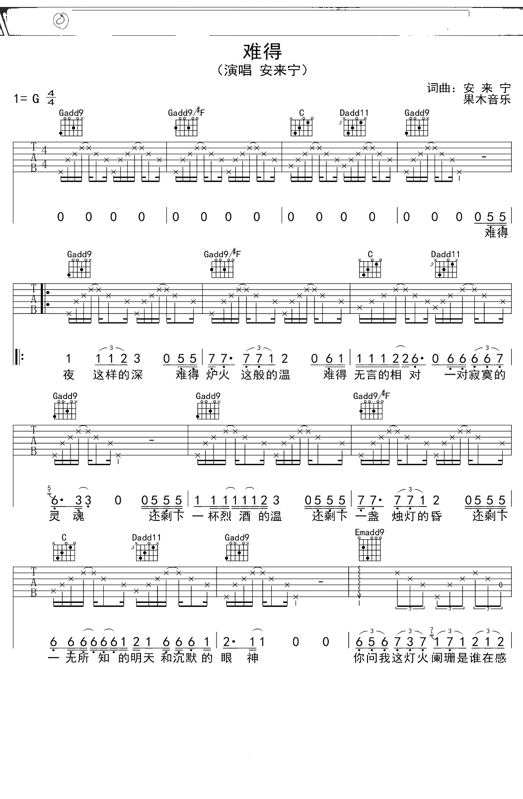 安来宁《难得》吉他谱 G调弹唱六线谱