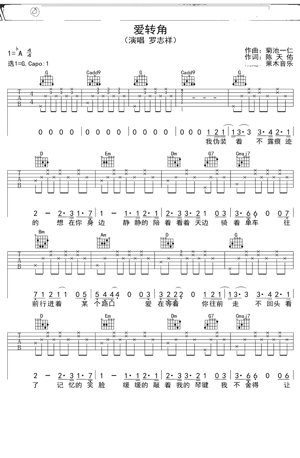 罗志祥《爱转角》吉他谱 G调弹唱六线谱