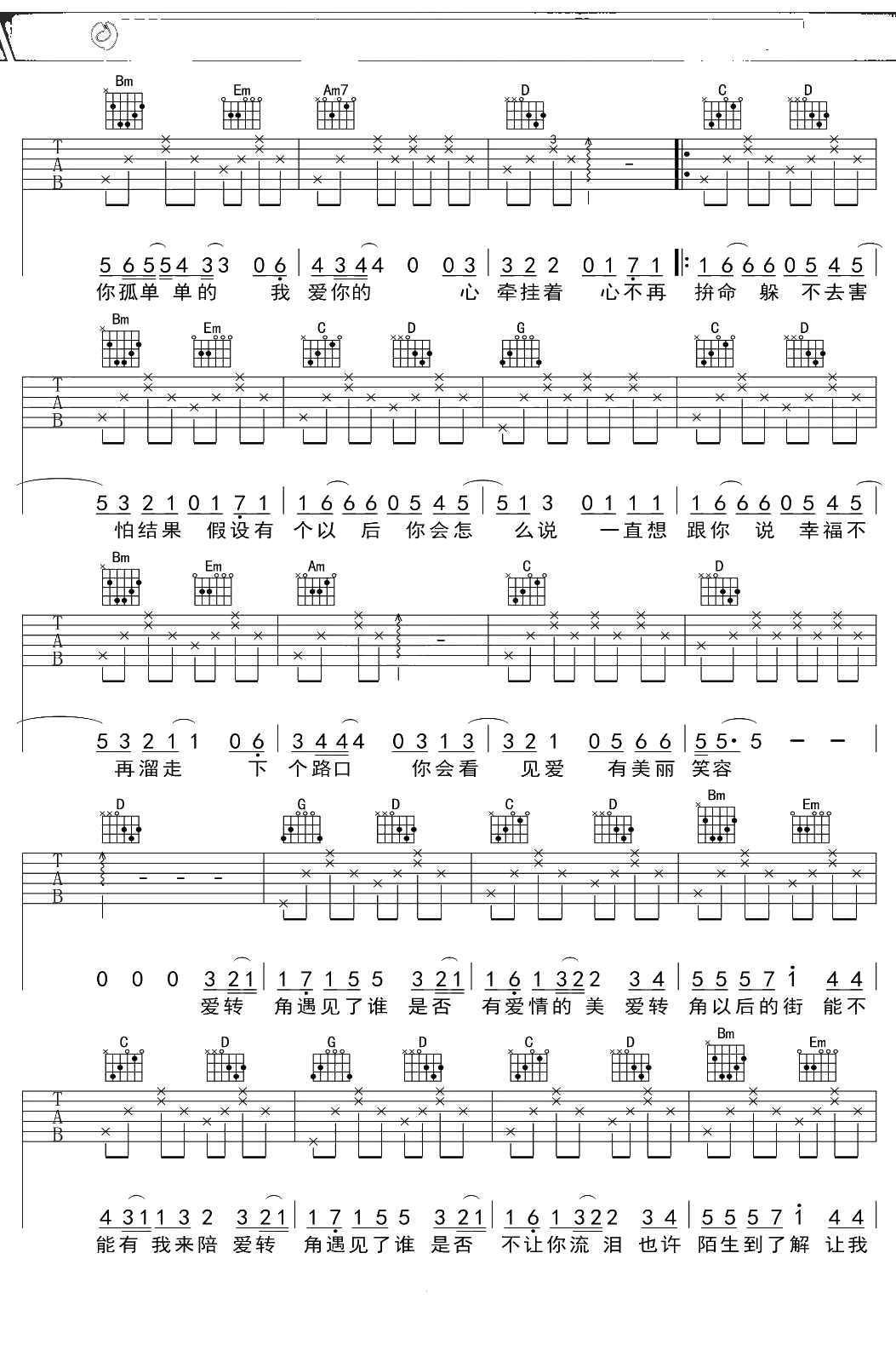 罗志祥《爱转角》吉他谱 G调弹唱六线谱吉他谱