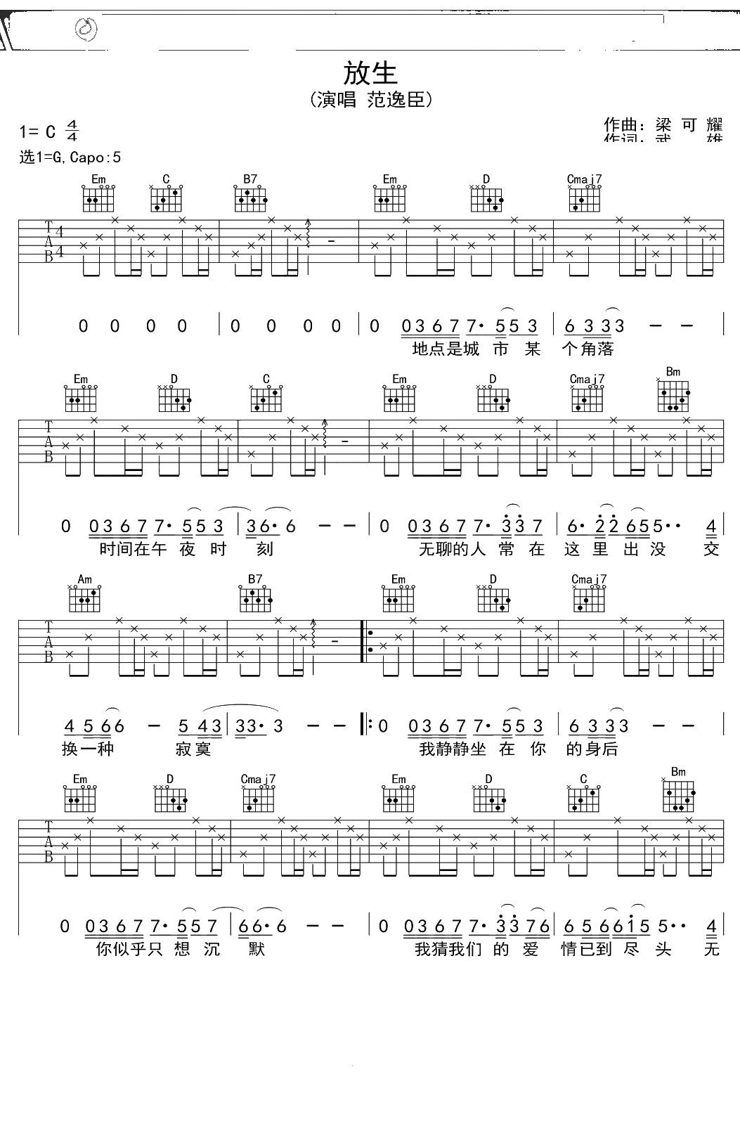 范逸臣《放生》吉他谱 G调弹唱六线谱