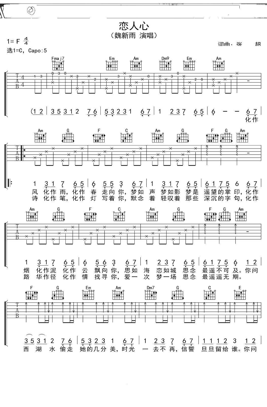 魏新雨《恋人心》吉他谱 C调弹唱六线谱