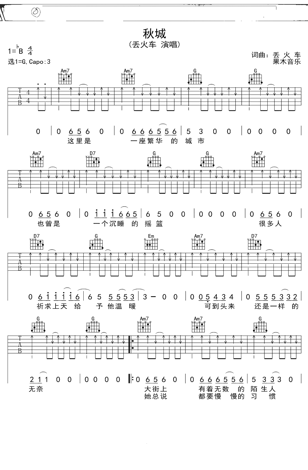 丢火车《秋城》吉他谱 G调弹唱六线谱吉他谱