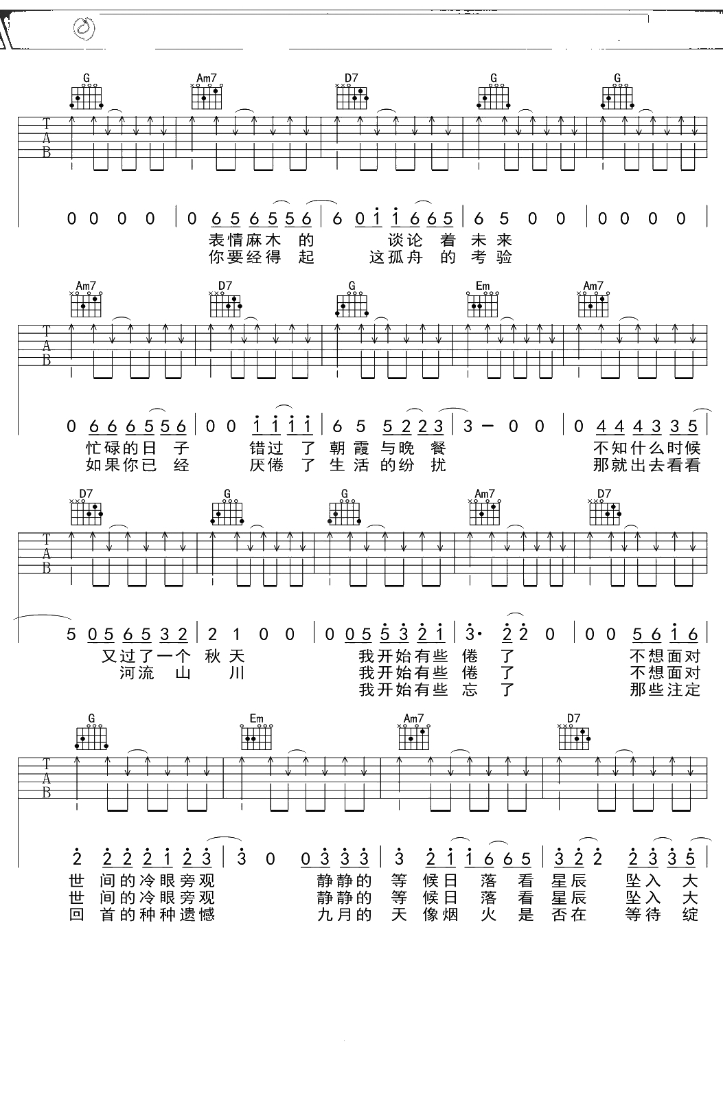 丢火车《秋城》吉他谱 G调弹唱六线谱