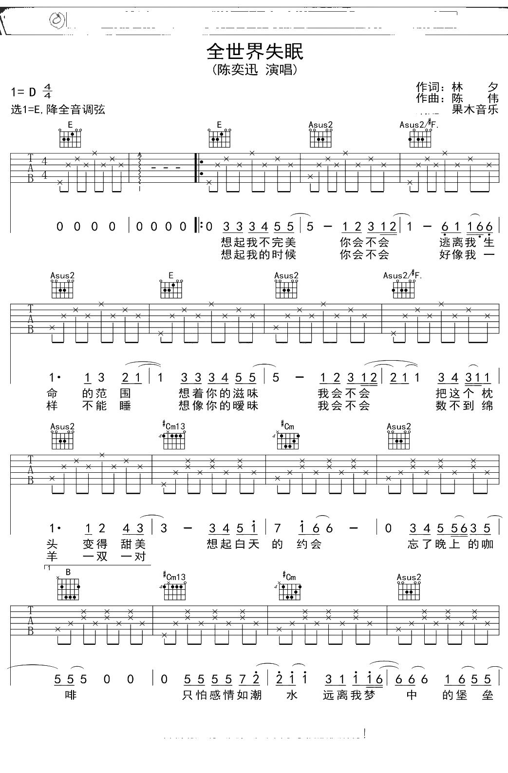 陈奕迅《全世界失眠》吉他谱 E调弹唱六线谱