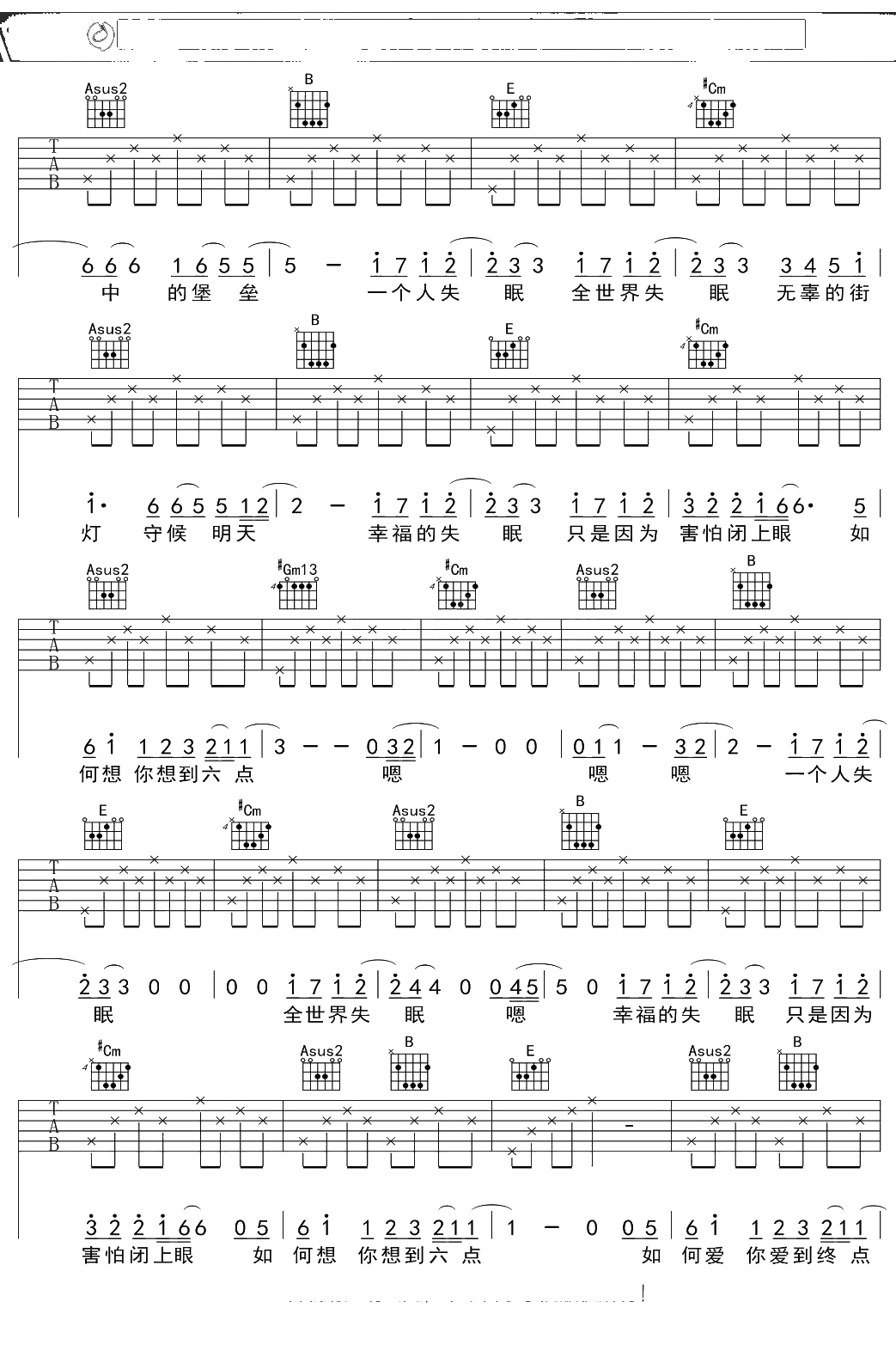 陈奕迅《全世界失眠》吉他谱 E调弹唱六线谱吉他谱