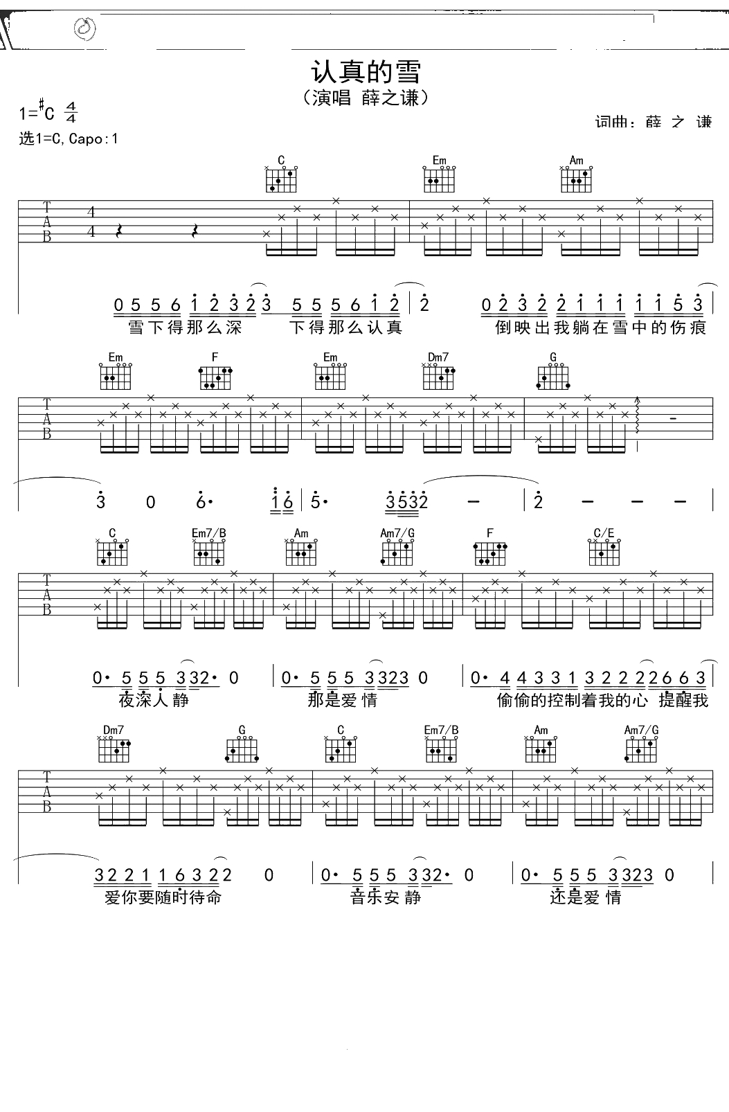 薛之谦《认真的雪》吉他谱 C调弹唱六线谱