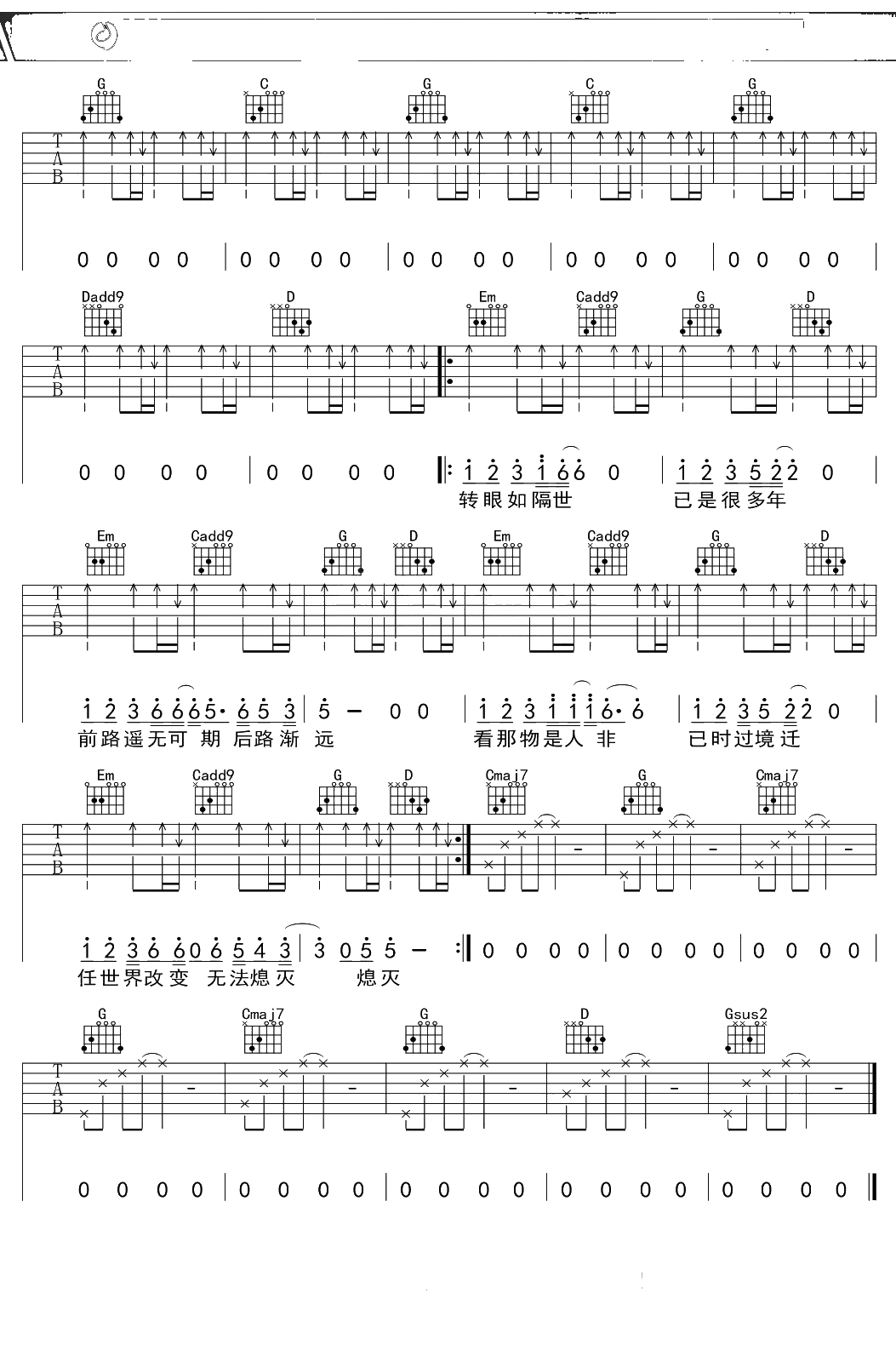丢火车《如斯》吉他谱 G调弹唱六线谱