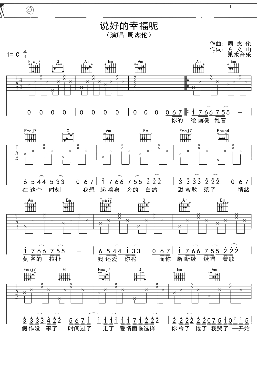 周杰伦《说好的幸福呢》吉他谱 C调弹唱六线谱吉他谱