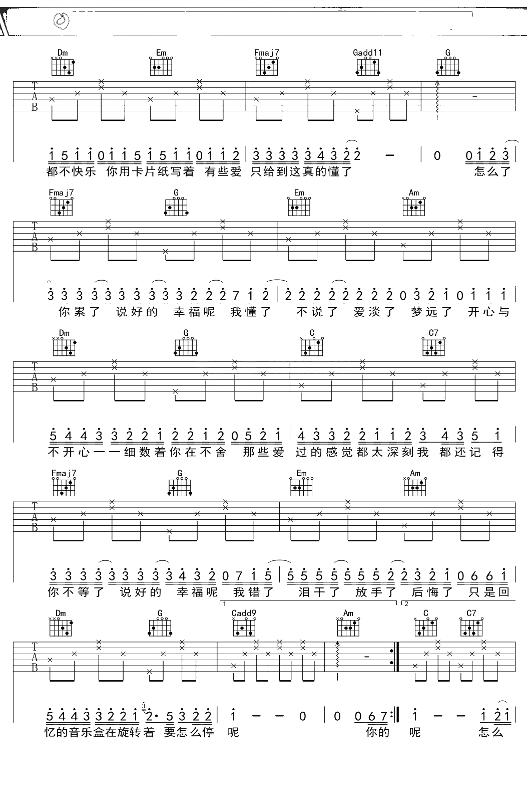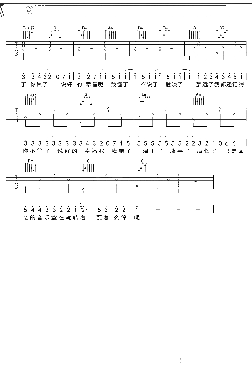 周杰伦《说好的幸福呢》吉他谱 C调弹唱六线谱