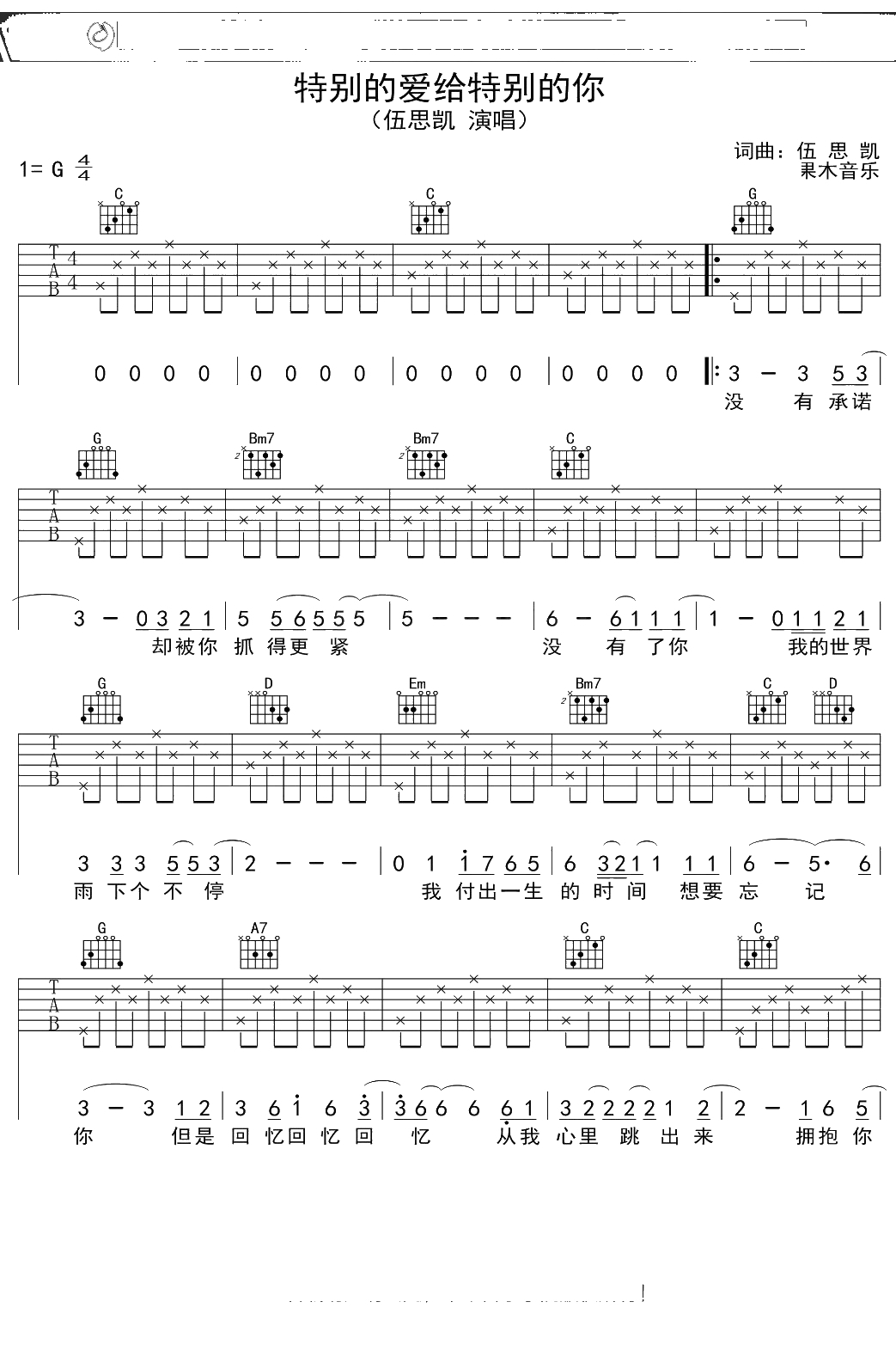 伍思凯《特别的爱给特别的你》吉他谱 G调弹唱六线谱