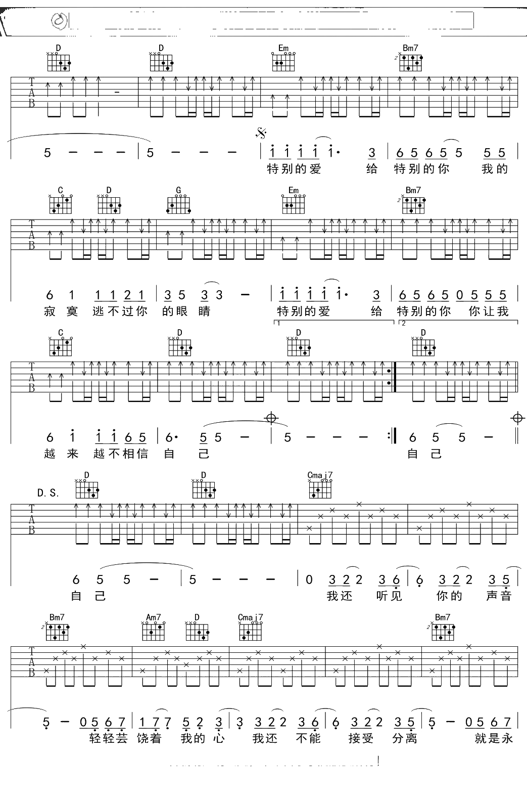 伍思凯《特别的爱给特别的你》吉他谱 G调弹唱六线谱吉他谱