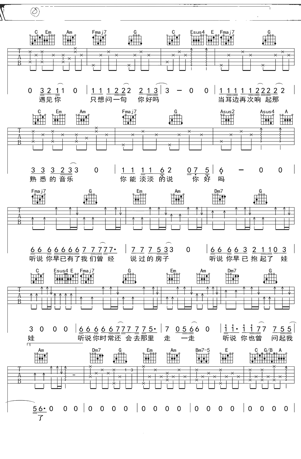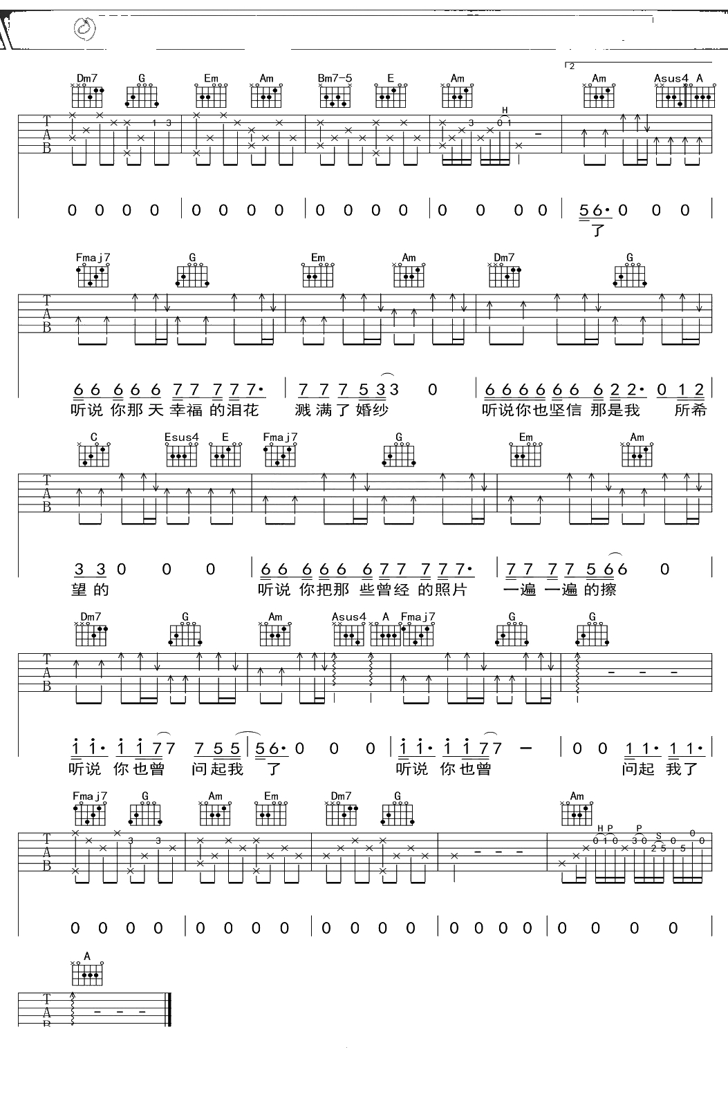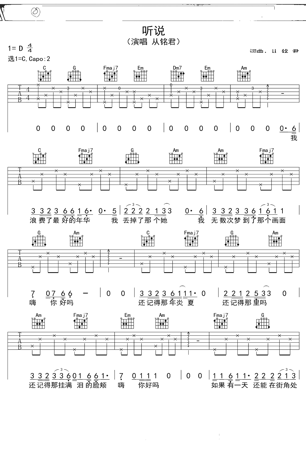 丛铭君《听说》吉他谱 C调弹唱六线谱