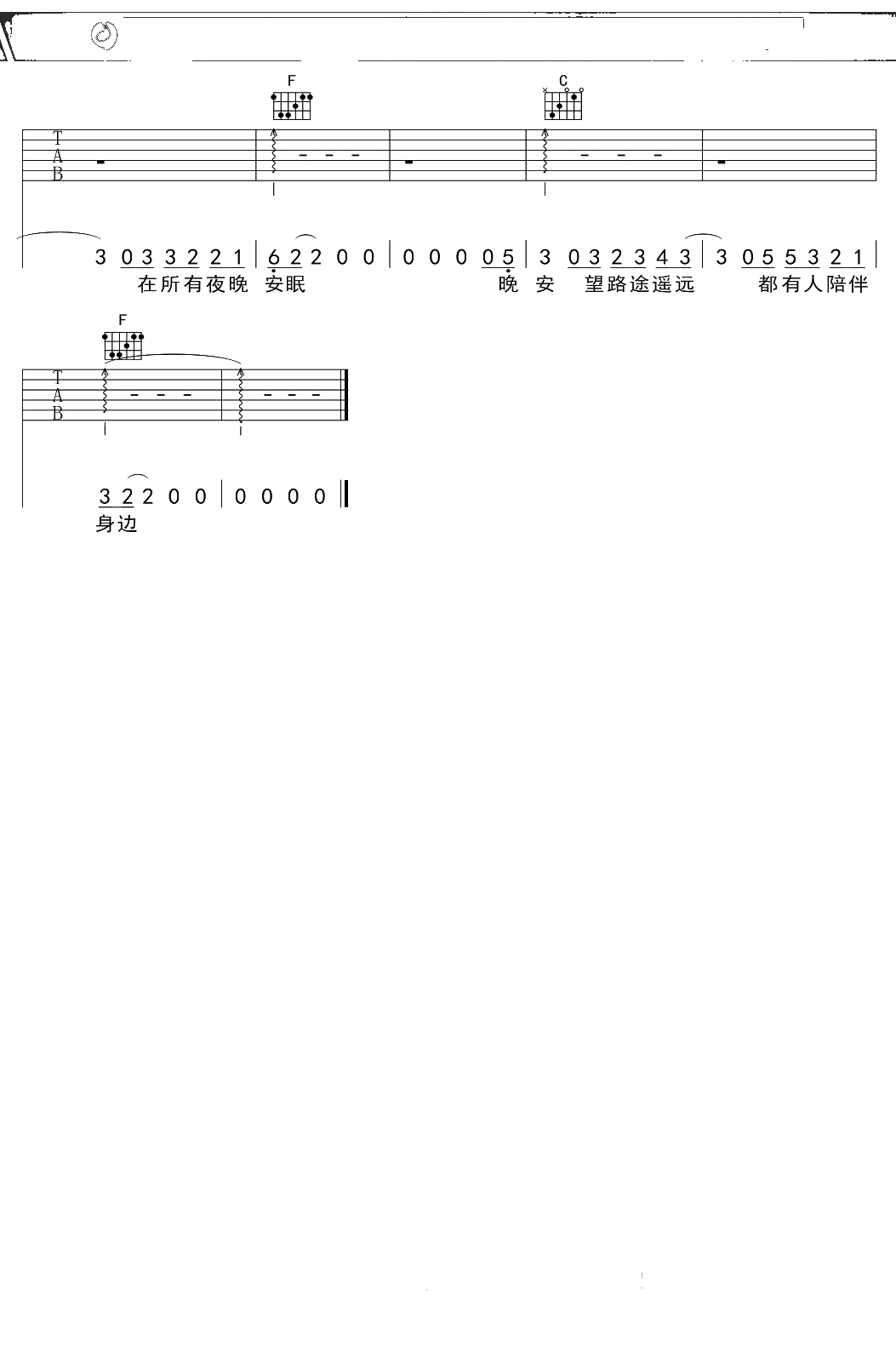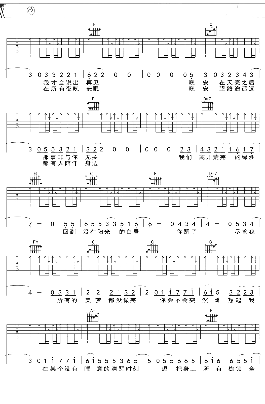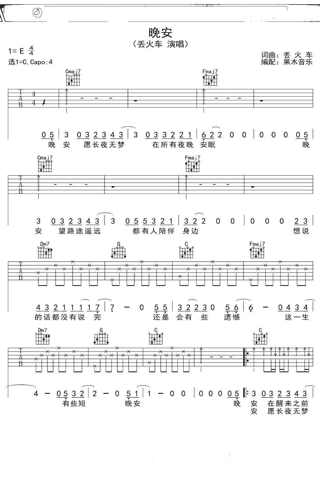 丢火车《晚安》吉他谱 C调弹唱六线谱吉他谱