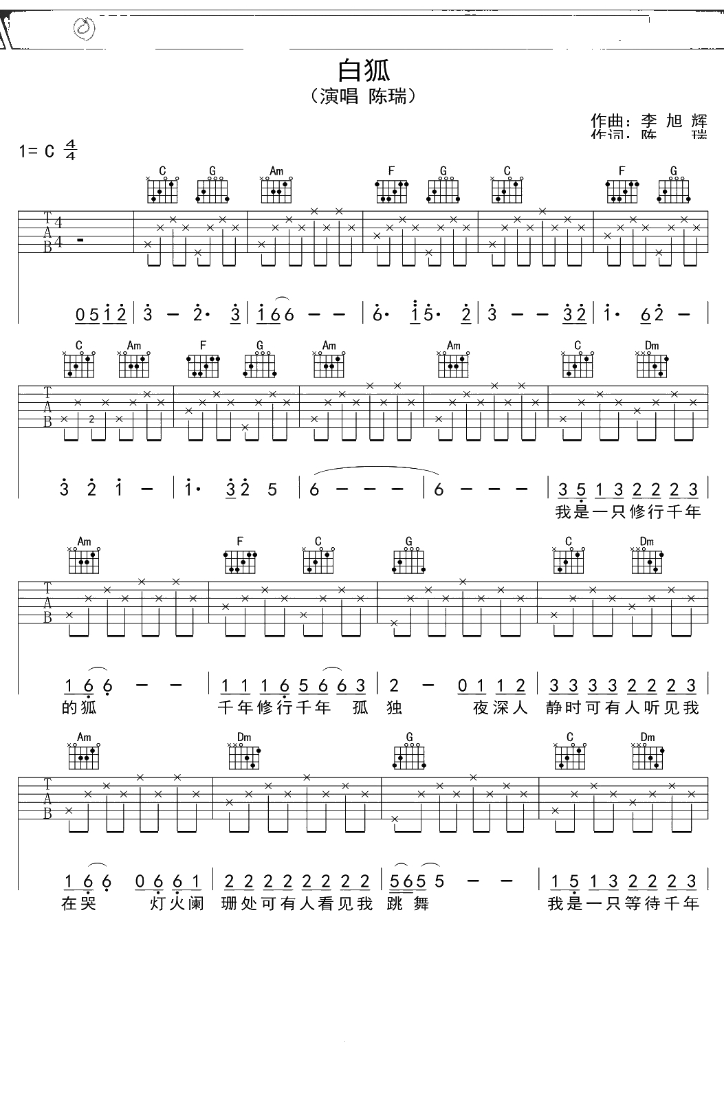 陈瑞《白狐》吉他谱 C调弹唱六线谱