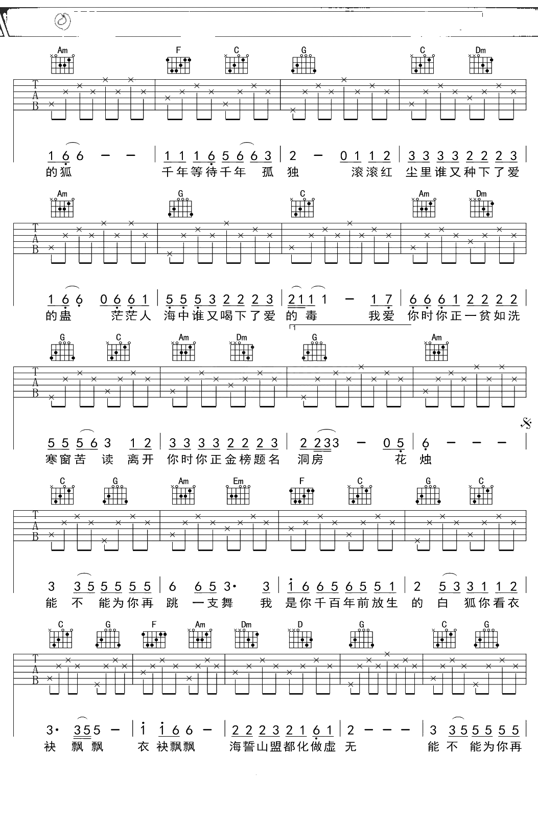 陈瑞《白狐》吉他谱 C调弹唱六线谱吉他谱