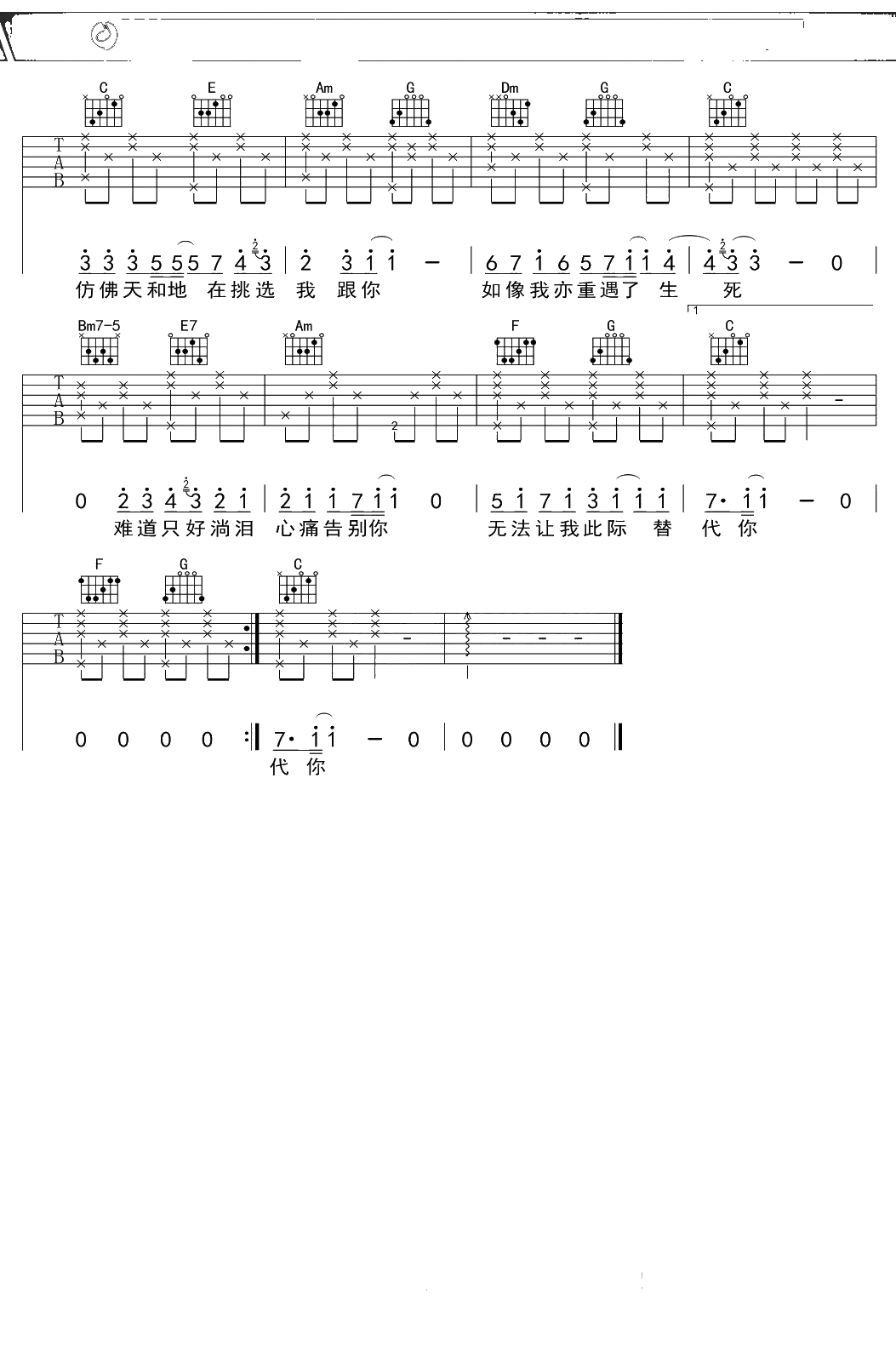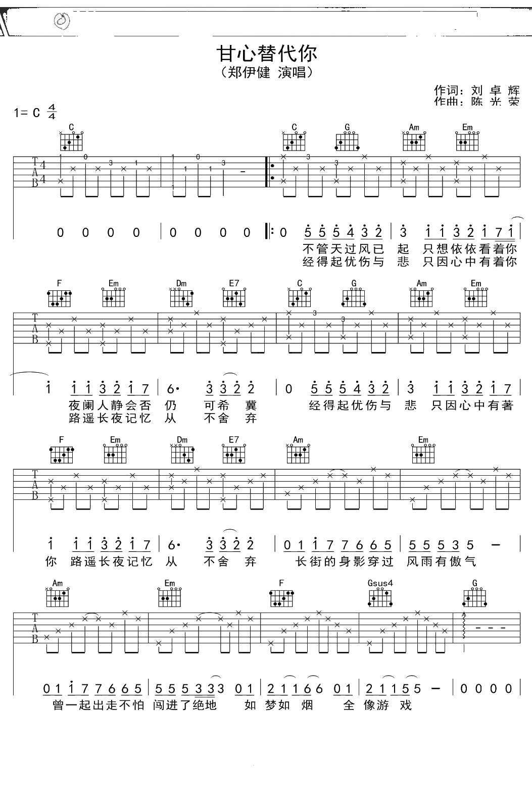 郑伊健《甘心替代你》吉他谱 C调弹唱六线谱
