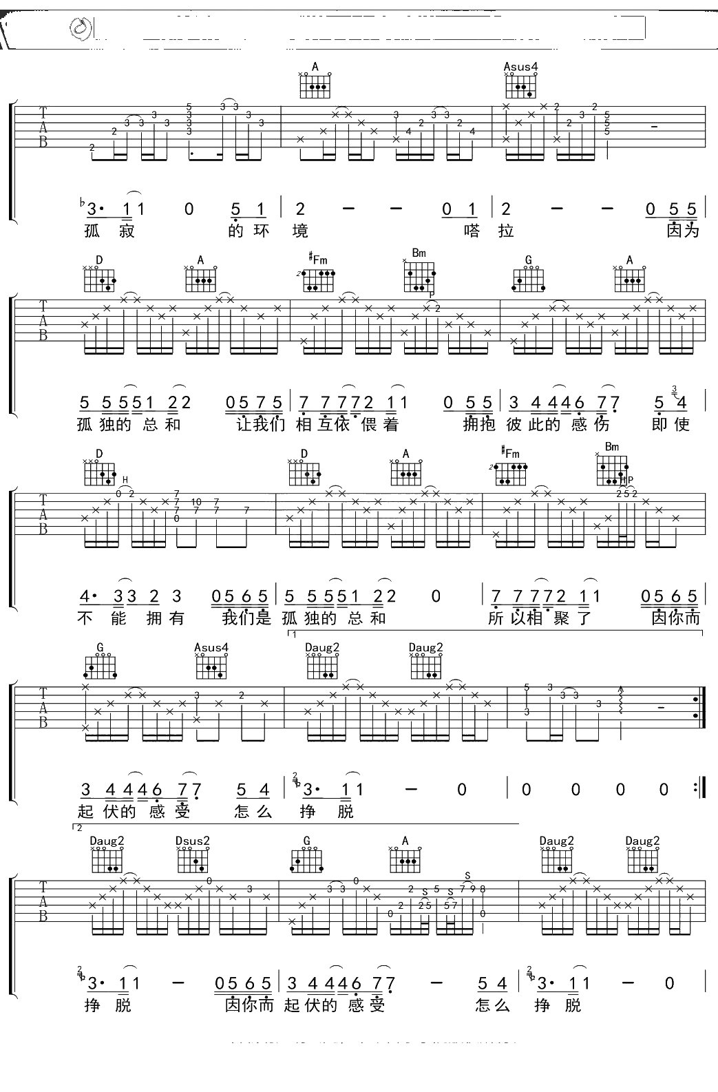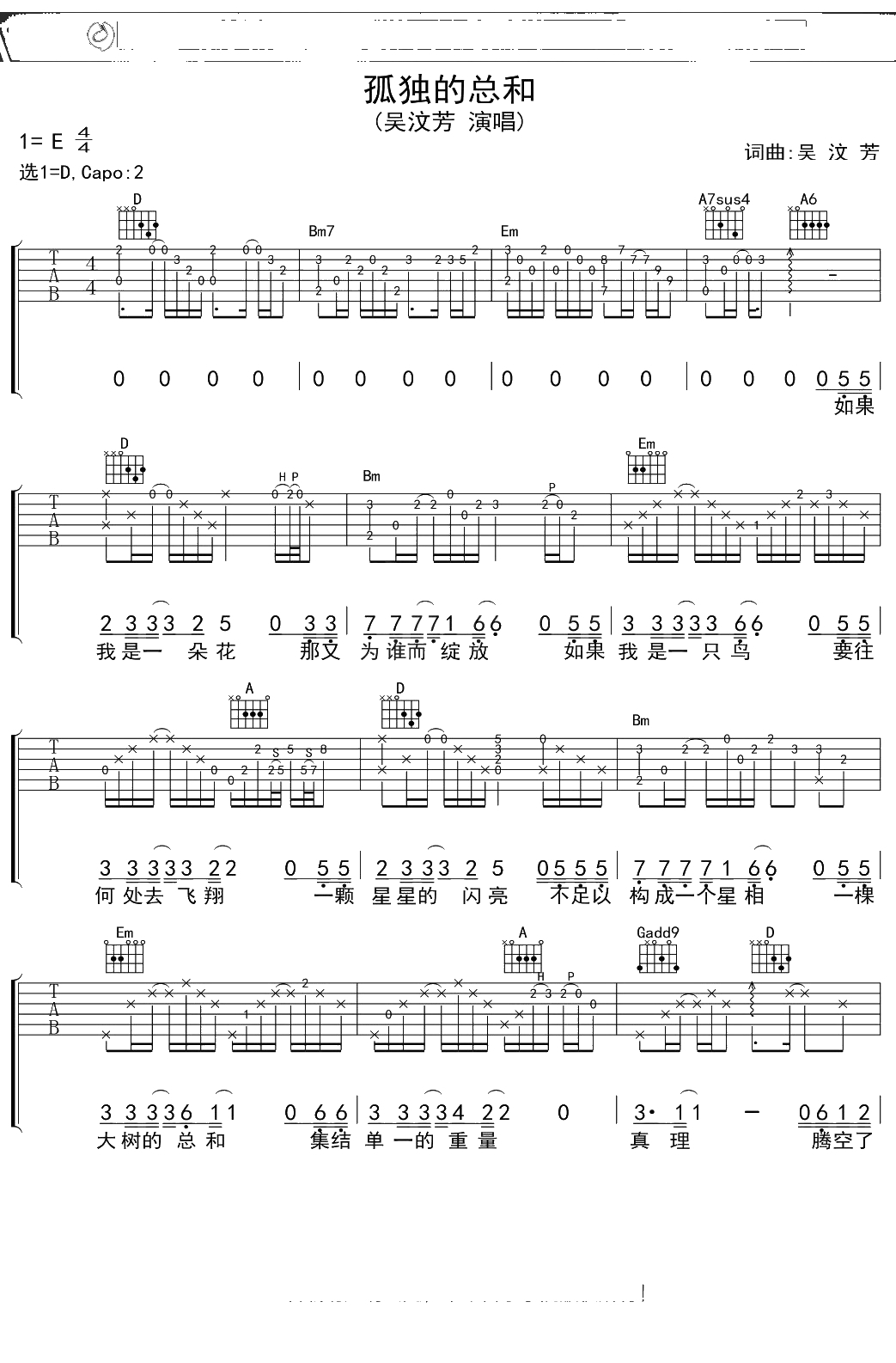 吴汶芳《孤独的总和》吉他谱 D调弹唱六线谱吉他谱