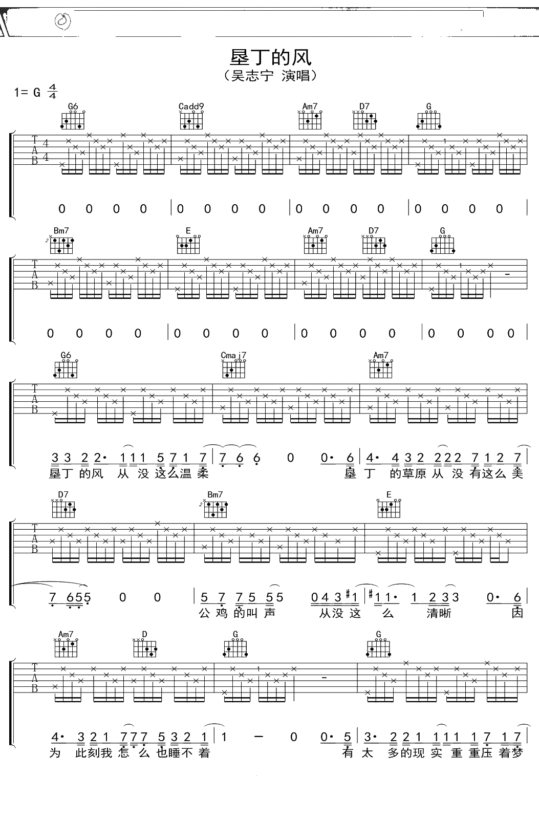 吴志宁《垦丁的风》吉他谱 G调弹唱六线谱