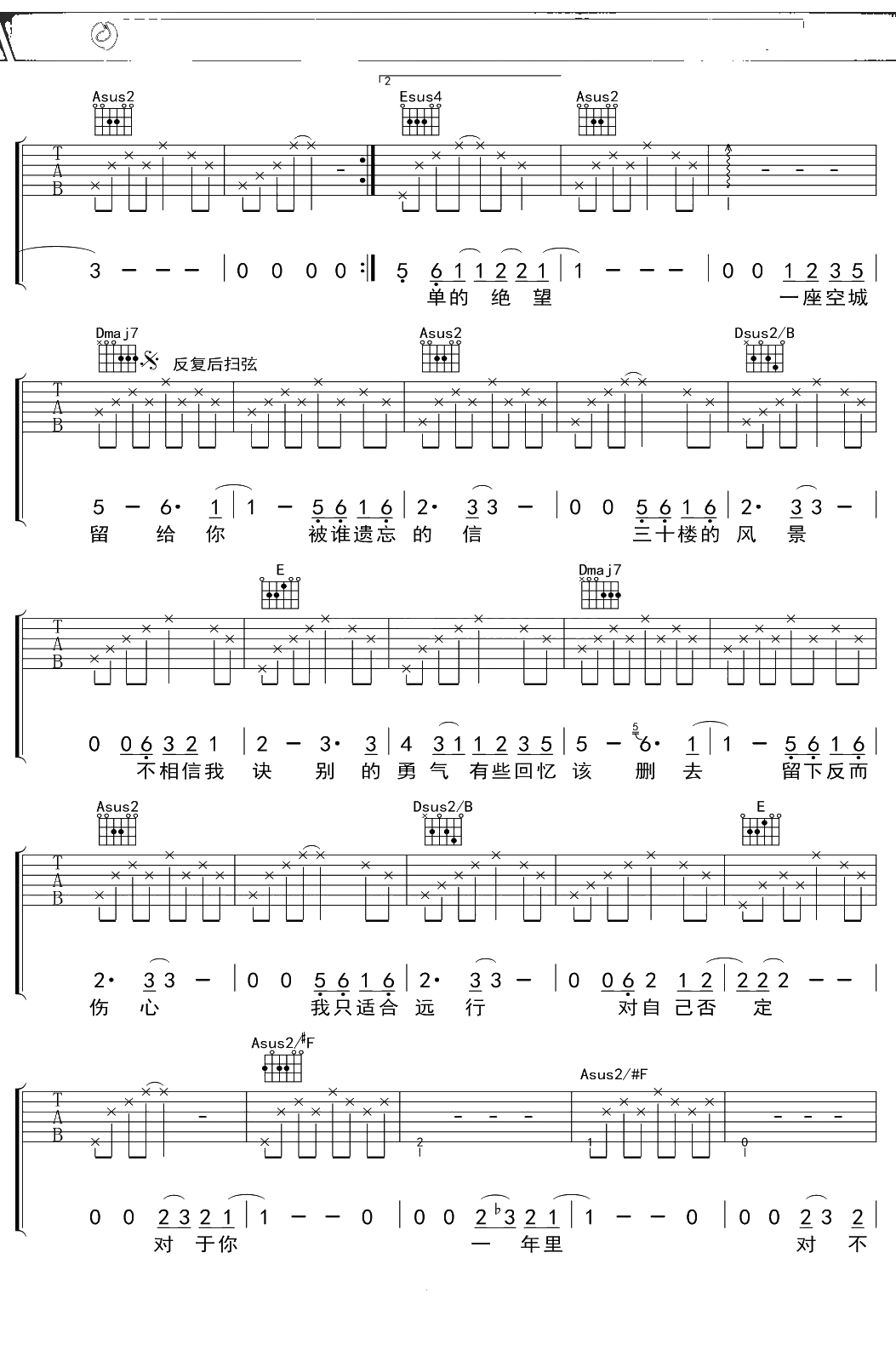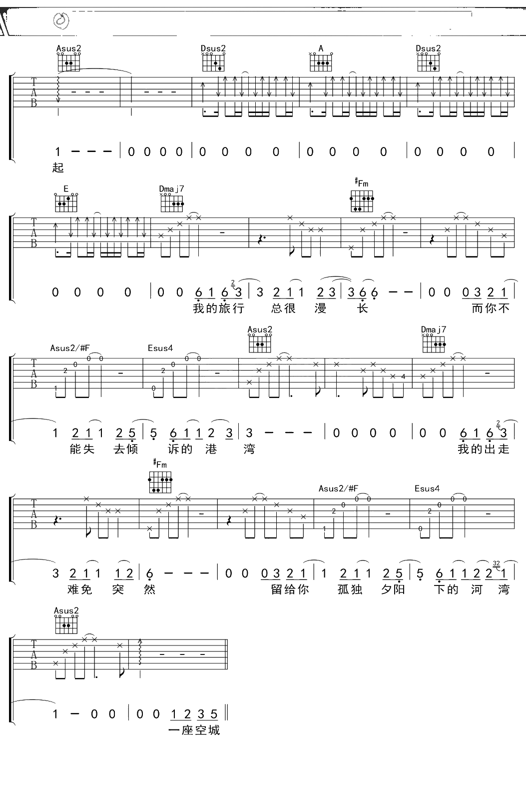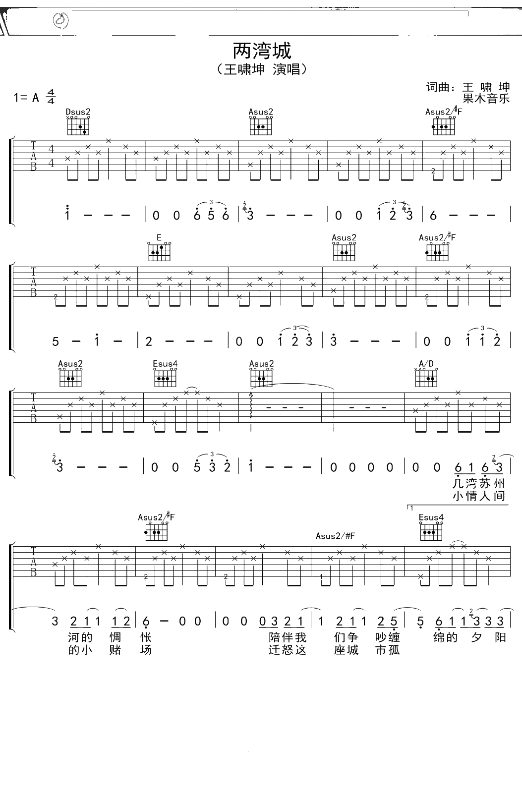 王啸坤《两湾城》吉他谱 A调弹唱六线谱