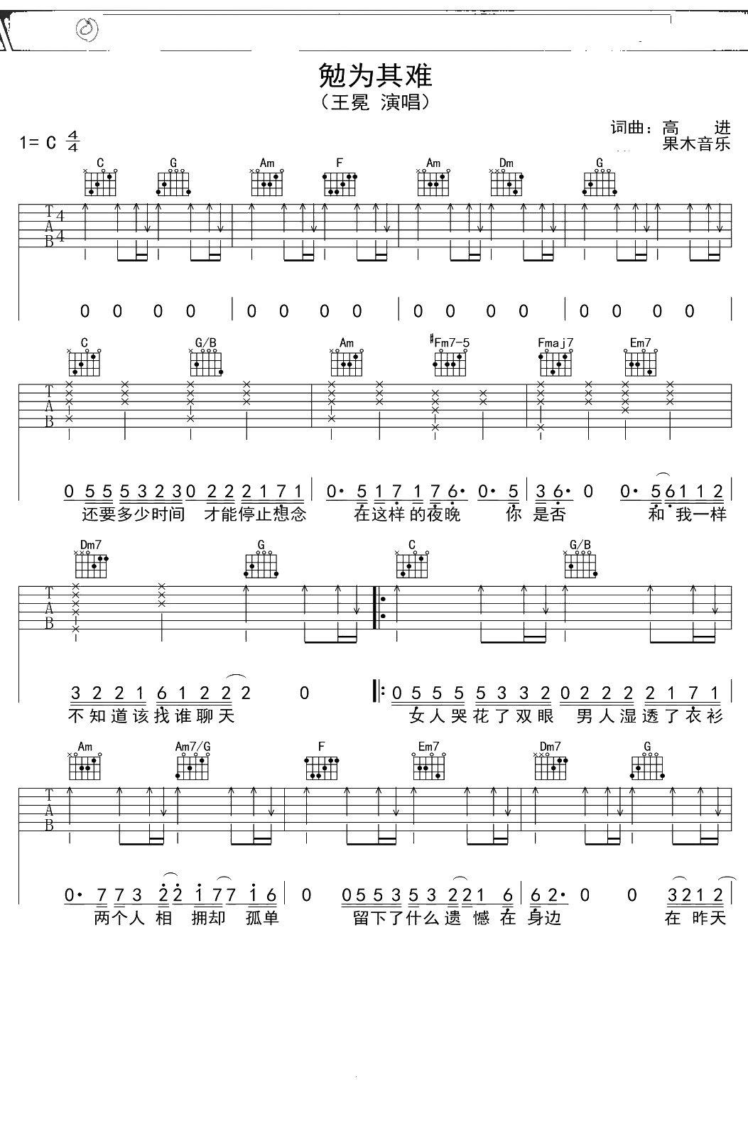 王冕《勉为其难》吉他谱 C调弹唱六线谱