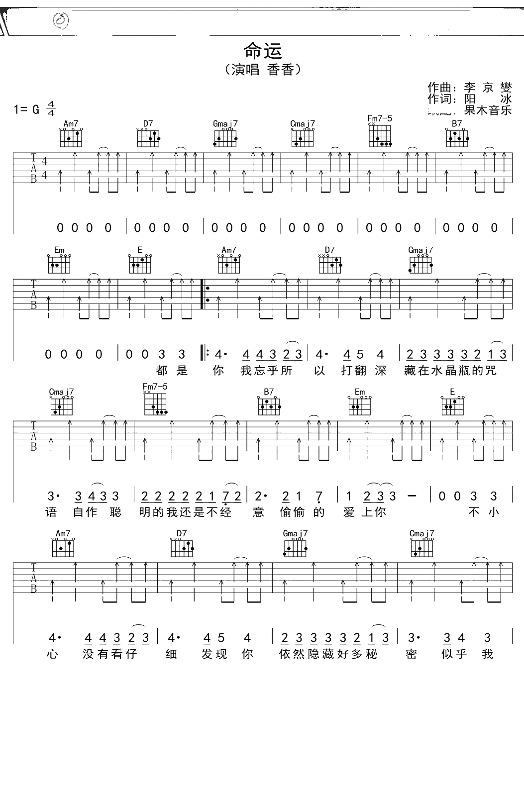 香香《命运》吉他谱 G调弹唱六线谱吉他谱