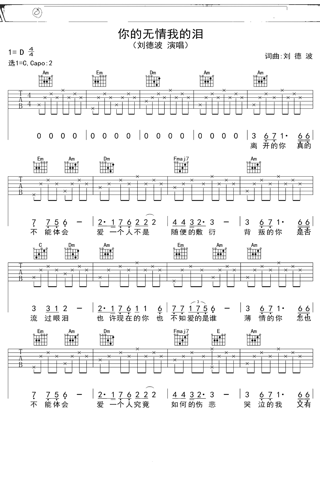刘德华《你的无情我的泪》吉他谱 G调弹唱六线谱