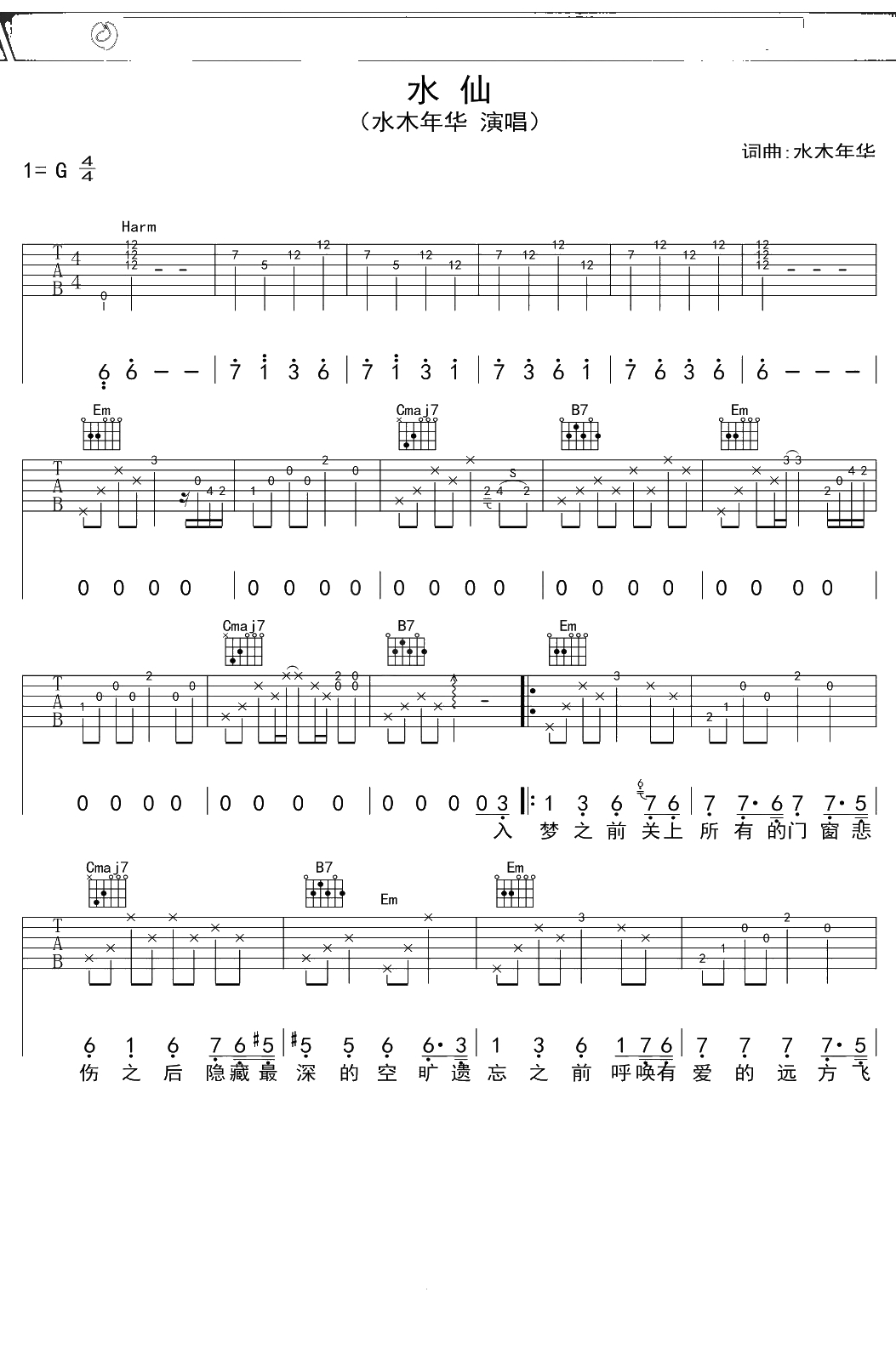 水木年华《水仙》吉他谱 G调弹唱六线谱