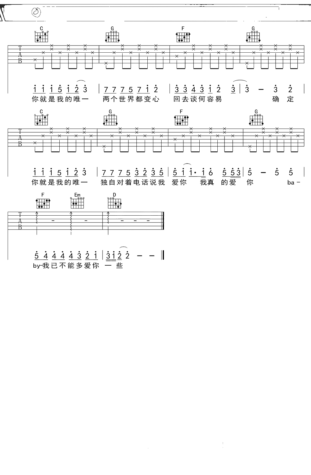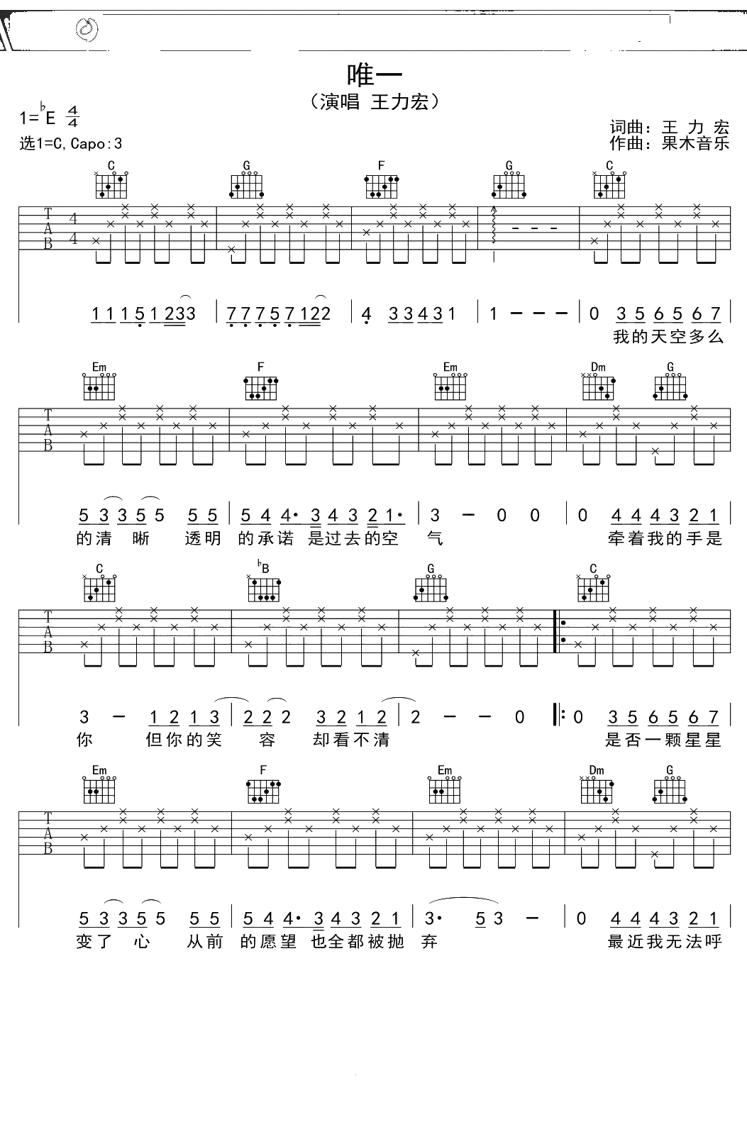 王力宏《唯一》吉他谱 C调弹唱六线谱吉他谱