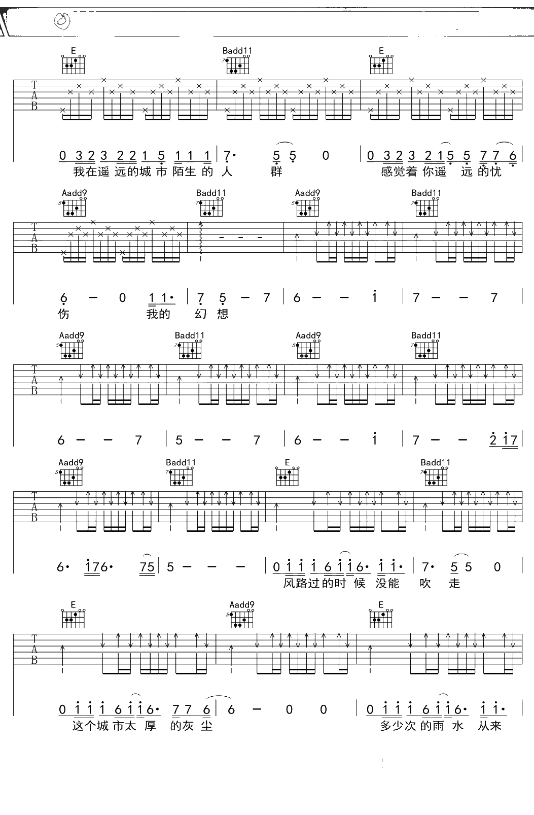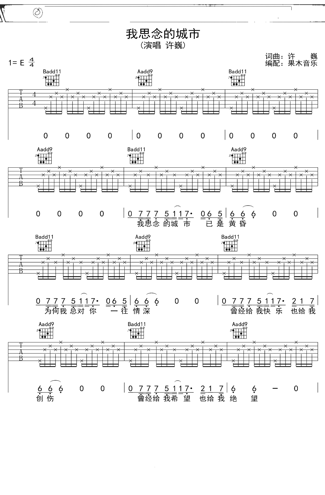 许巍《我思念的城市》吉他谱 E调弹唱六线谱