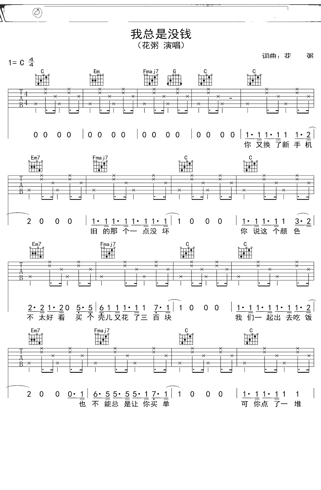 花粥《我总是没钱》吉他谱 C调弹唱六线谱