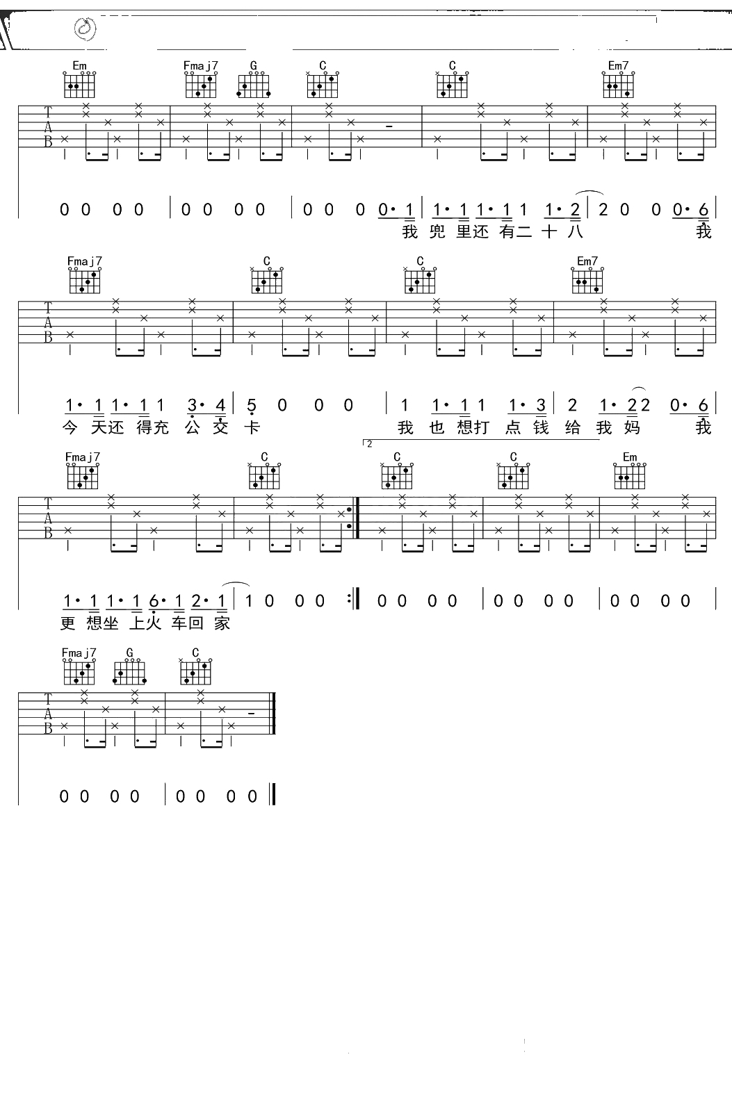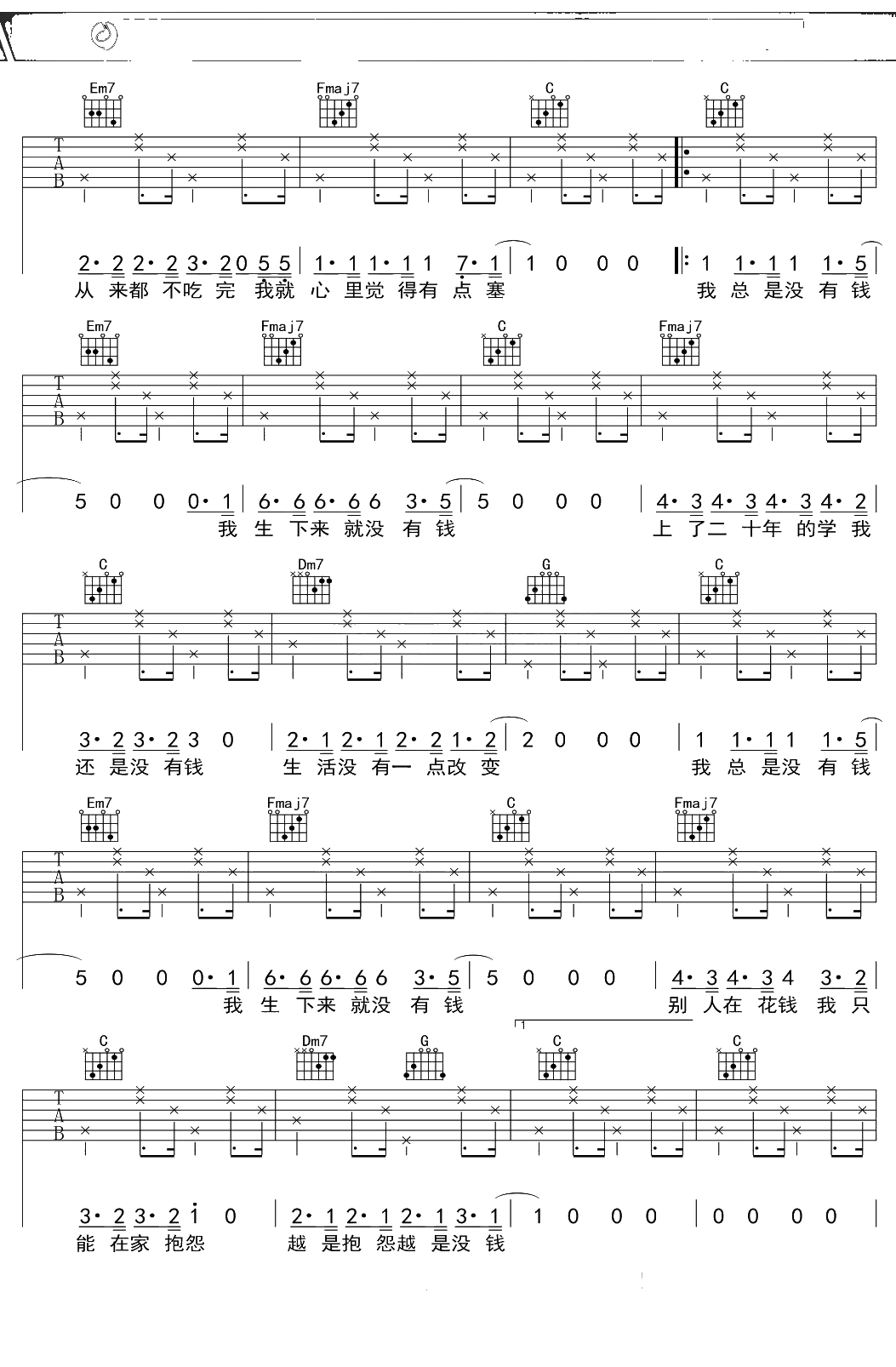 花粥《我总是没钱》吉他谱 C调弹唱六线谱吉他谱