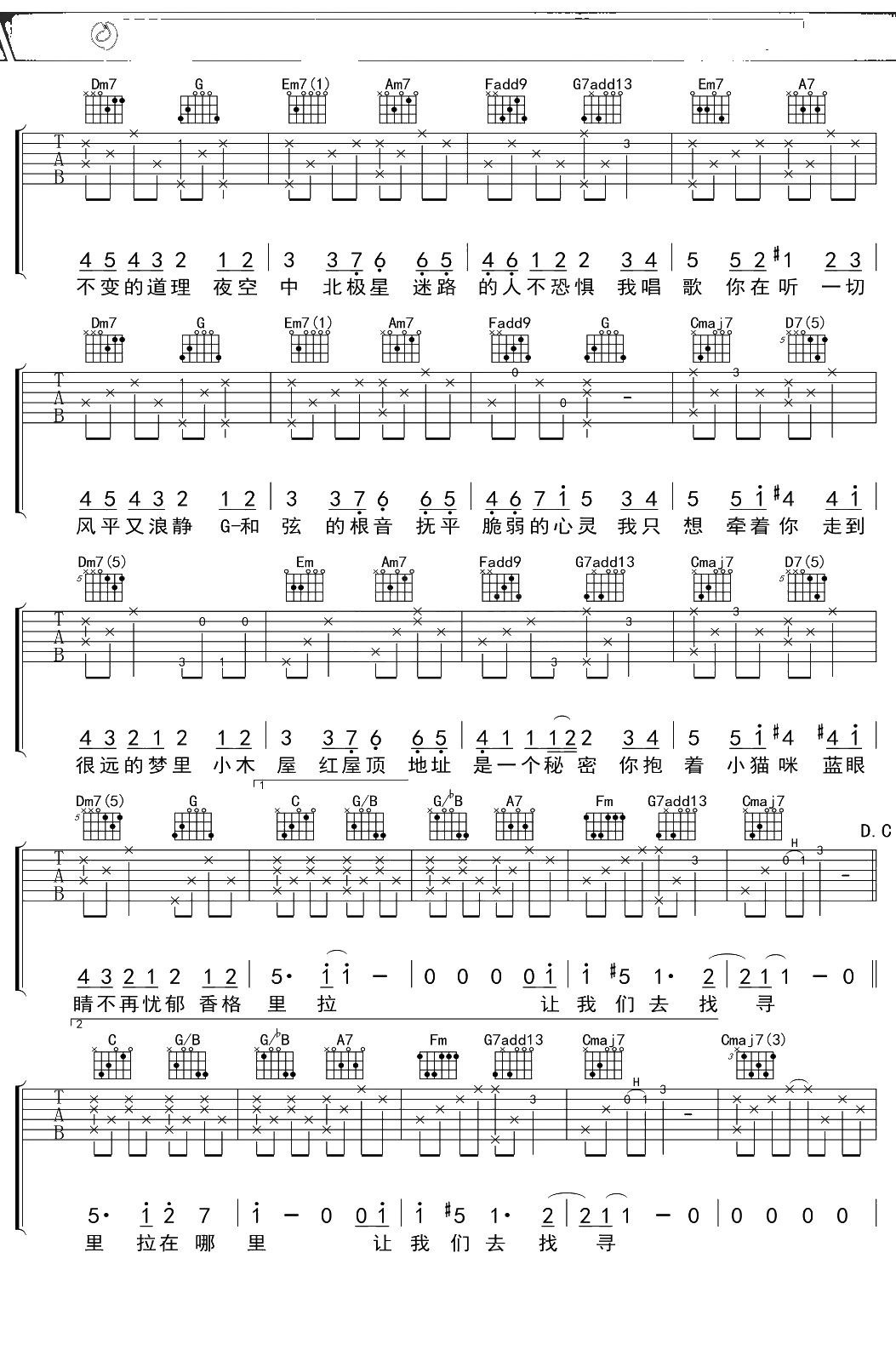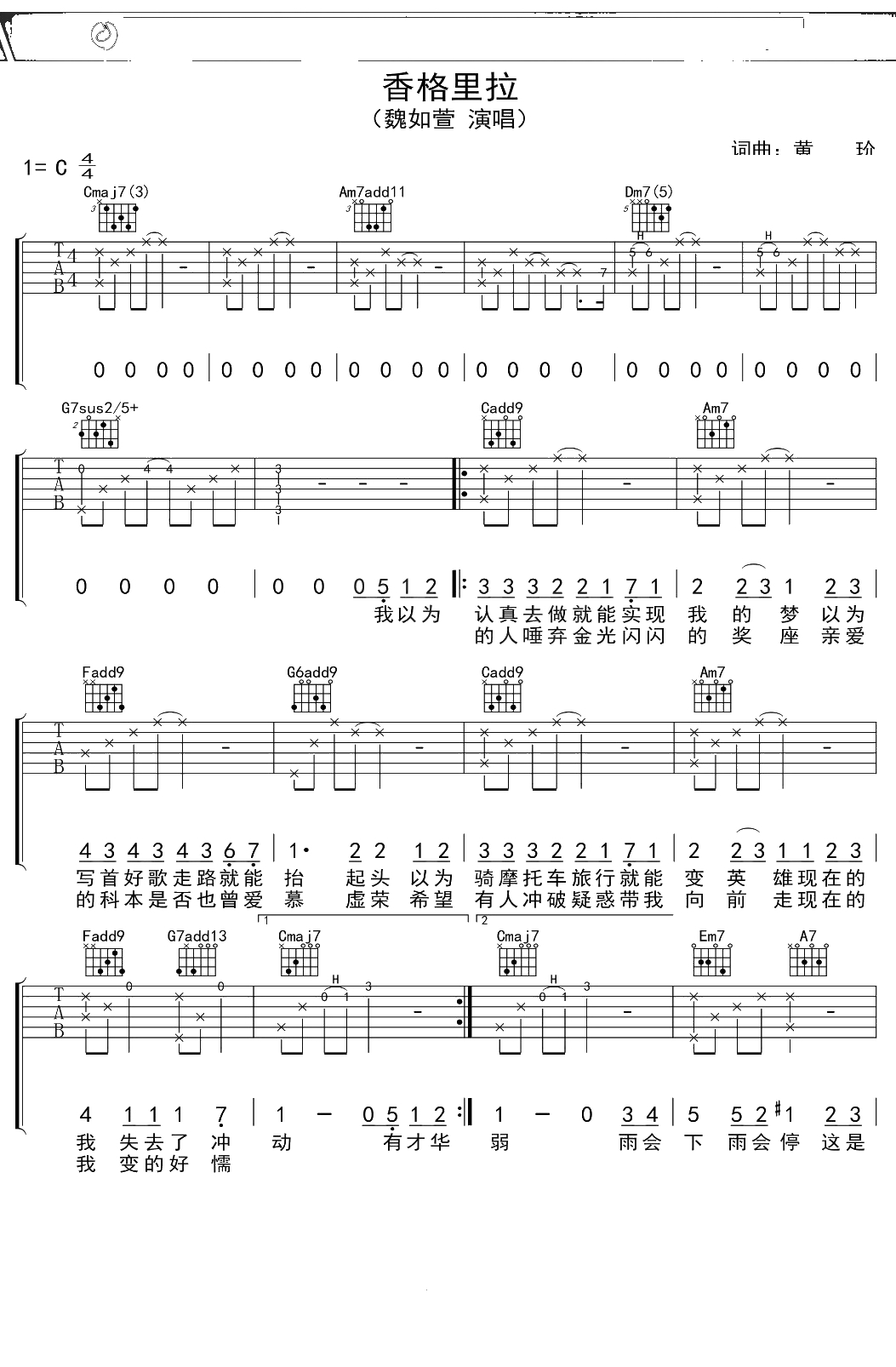魏如萱《香格里拉》吉他谱 C调弹唱六线谱