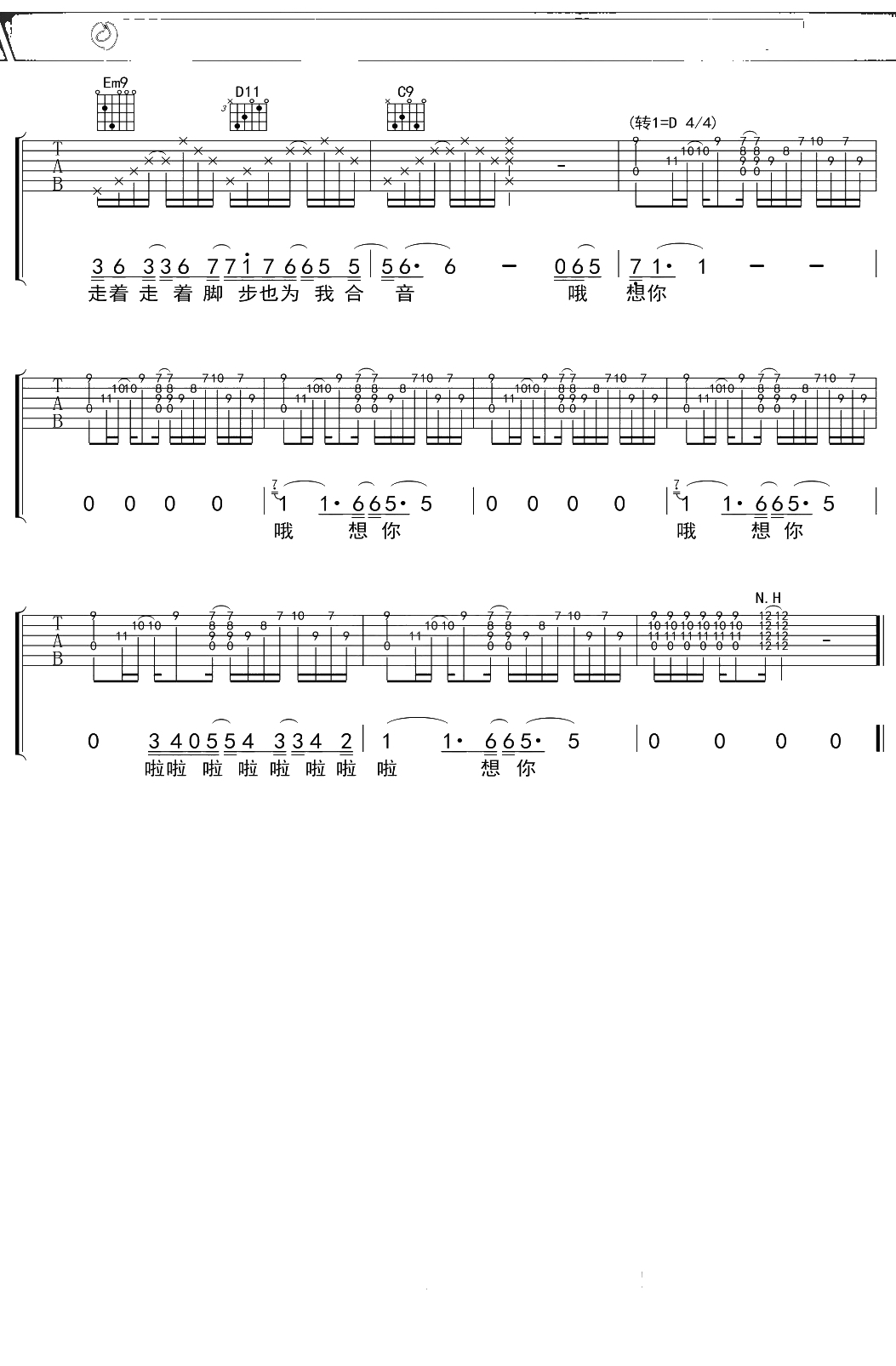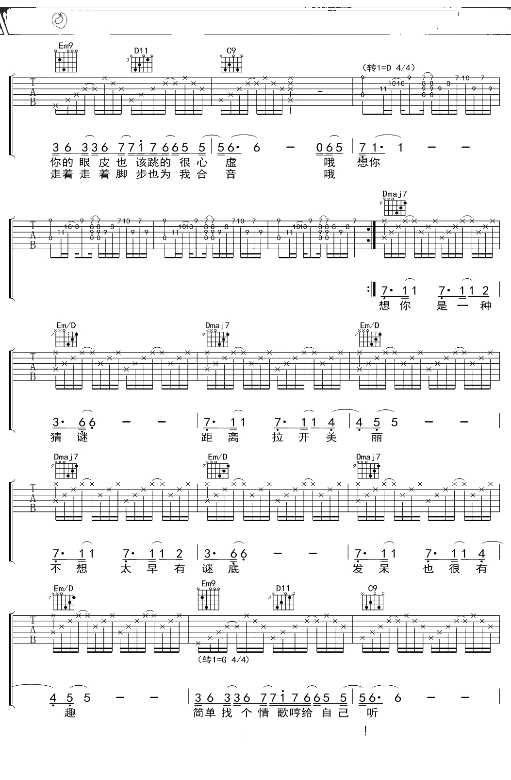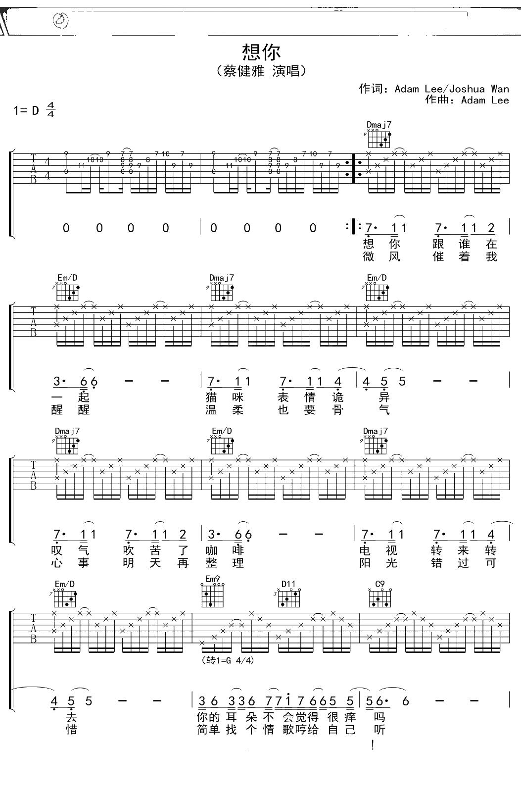 蔡健雅《想你》吉他谱 D调弹唱六线谱吉他谱