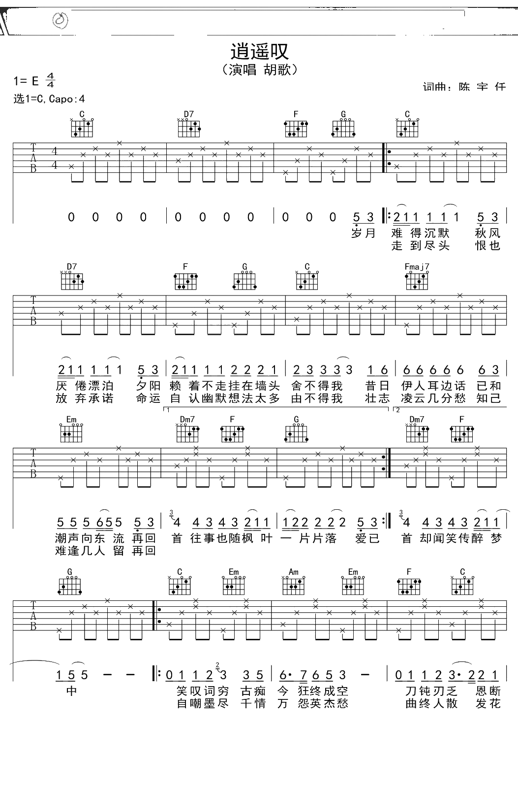 胡歌《逍遥叹》吉他谱 C调弹唱六线谱
