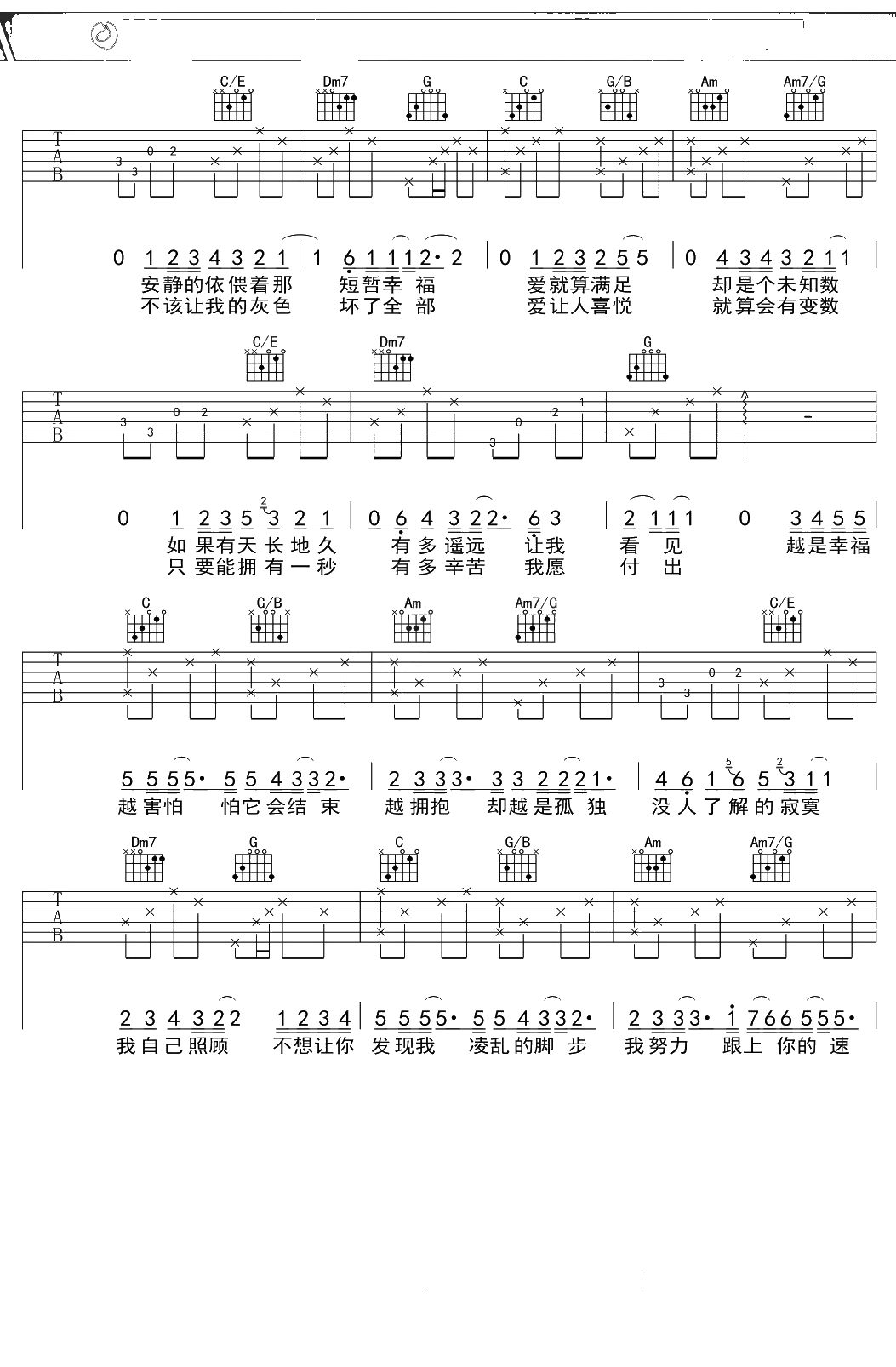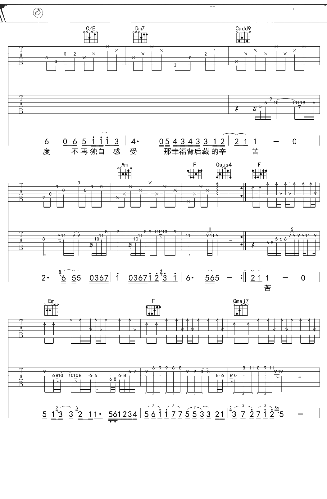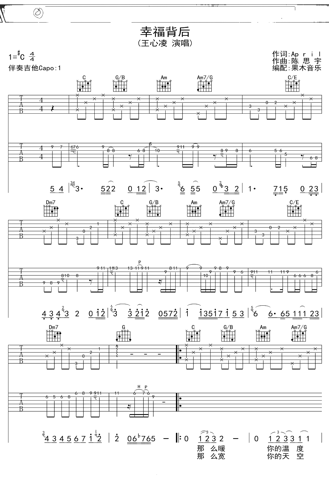 王心凌《幸福背后》吉他谱 C调弹唱六线谱